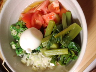 野菜たっぷりそうめん。 蒸し暑い日だったのと、お米が残り少ないため。 トマト、つるむらさき、長ネギ、おくら、ゆでたまごをトッピング。 あとは棒餃子と蒸したトウモロコシ。