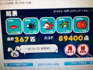 近頃どうやらすっかりご無沙汰だけど、 ちょっと前まで楽天グリーティングのゲームカードに ハマッてました。 その中でも何故か無心に、そう、一心不乱に集中する ストレス発散のようなストレス増加のようなゲーム。 金魚すくい。 まず初めてやると目標の30は楽にクリア。 まぁこんなもんかな。この手のゲームの難易度は。 とタカをくくっておりました。 しばらくしてまた何か単純なのがやりたくなって また挑戦してみると・・・数字がまだ伸びそう。 そう思うと伸ばしたくなるのが人の性 頑張って100匹釣ったとさ。 しかし、そのうちに不思議な現象に気づく。 このたま~に流れる”星”は一体何なのか? あそびかたにも載っていないがまさか何か意味が!? 早速挑戦! ・・・だがしかーし! すくおうとしてみたが、すくえない。 これは果たしてすくえるのか? いやいや、どうやら決まった匹数で現れるらしい。 (かなり研究した) 意味のないものは作るまい・・・ そう思い幾度か挑戦。 すると普通に金魚を狙ったのに偶然すくえたではないか! ポイが黄色くなった! こ、この色はマリオでいえばスターか! Gガンダムでいえばハイパーモード! いわゆる”無敵状態”に違いない! (俺の右手が真っ赤に燃えるぅ♪) ・・・ ・・・そして格闘すること幾日かが過ぎ、 367匹! 下のうさおのコメントが変わっていくのが楽しい。 気になったらやってみては!? →金魚すくい
