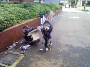 先日、担当の係長と一緒に 印刷機器メーカーの展示会に行ってきました。 久しぶりに歩く小倉駅北口。 いろいろ変わってるなぁ。 たとえばアレ・・・ アレ・・・? 変わっている(意味が違う)オブジェだ。 オブジェ? いやいや少し変わった止め方をした原付だ! 器用だね。写メしちゃったよ。思わず。 ・・・変わった止め方でなかった場合はごめんなさい。
