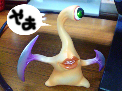 ヤッチャッタYOH作っちゃったYOH 会社で。(オイッ!) 大丈夫。就業時間外だから。一回帰った後だし。そんなこともあろうかとね。机の上に飾っていたのさ。ミギー。 それだけ。今日はそれだけ。こんな風にできたらなぁ~と思っていたのです。どうやってやったらいいかチンプンカンプン。とりあえず昔とったKINEDUKA。イラストレーターでミギーを作って♪画像で保存して♪HTMLタグを探して・・・パクって・・・・・・・・・・・・がんばって作りました。 完成度が【とりあえず】レベルなのはここのタイトルに免じて許してたもれ。