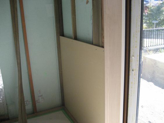 棟梁さんは内壁のボード貼りを始められていました。レッドパインムク材の貼られる寝室の壁に1枚の石膏ボードが貼られていました。部屋の中に壁用と天井用の不燃石膏ボードがたくさん積んで置かれていました。「厚い方が壁用で、薄いのが天井用です」と気密測定後、監督さんが説明して下さいました。