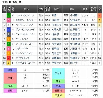 帝王賞 G1 結果 優勝は〇1番人気スマートファルコンが9馬身差の圧勝で5連勝2着も2番人気◎エスポワールシチーで3着も3番人気バーディバーディと人気順で決まり三連単 6-11-1 290円 一番つまらない結果でがっくりです。スマートファルコンは強すぎる内容で圧巻です。せめて地方の雄フリオーソが出走してれば面白かったと思いますが。1・2着は予想通り、年に何回かあるかないかの銀行レースで 馬連 6-11 140円 しかしぐ~たらは1・2着~4・5着と3着バーディバーディ無印で撃沈欲を出したらこういう目に遭います。金もやったらねぇ~ ええ利子になったのに・・・クリックしてね にほんブログ村