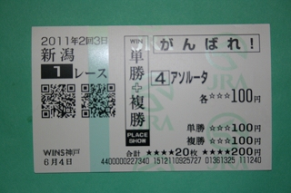 アソルータ 出走新潟1R ダート1800m 晴 やや重 圧倒的1番人気(1.7倍)に支持され条件が揃い、待望の初勝利へ向けて出走しました。スタートもまずまず。コーナーワークを利して逃げの作戦にでました。スムーズに4コーナーを回り、後ろからは付いて来るのは1頭のみ。200mを過ぎると2頭のデットヒートになり、外からの追い込みサマーティアラの方が脚色が良く差し切られ、そのまま2着になりました。今日は本当に勝つことしか頭になかったので、ショックです。どの馬と走ってもマイペースのようで、運もあまりないように思いました。あと3ヶ月で未勝利戦終了どうするんやろ~もうひと踏ん張り頼んますわ