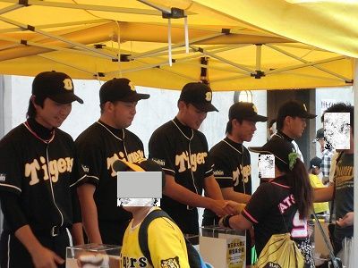 今日の甲子園 試合前17時から30分間阪神タイガースファーム選手5投手による東日本大震災義援募金活動がありました。ぐ~たらと長男も少しながら気持ちさせてもらいました。 左より 36 一二三投手 124 吉岡投手 27 秋山投手 40 ジェン・カイウン投手 19 ショウ・イッケツ投手 長男も昨シーズン終盤頑張った秋山投手と握手5人の若虎もにこやかに全員握手してくれました。ご苦労様そして1軍のマウンドで待ってま~す。将来のエースへ 頼むで クリックしてね にほんブログ村