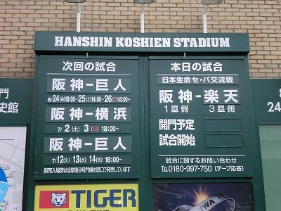 今シーズンぐ~たらの初観戦となった甲子園のタイガース今シーズンはかなりの出遅れ5人の虎党でライスタで観戦しました。阪神タイガースvs楽天イーグルス 交流戦色々な事で波乱の連続でした。かよく分からない天候での試合開始 スタメン 開始時はいきなり先発の能見が松井稼にツーランで先制を許し、重い雰囲気に3回いきなり大粒のが せっかくマートンがスリーベースヒット打って反撃開始ムードやったのに 水を差された~その直後1回目の中断です。約1時間中断 こんな時はやっぱりこれ再開後、即平野がタイムリーヒットを打ち1点差しかし6回裏またもやが・・・これは止む気配なくしばらく様子を見てましたが、雨天コールド1-2となんだか後味の悪い敗戦になってしまいました。さらに帰ってからデジカメがないことに気付く球団事務所に連絡すると清掃の方が見つけてくれてたらしく、防水ケースに入れていたため、にも負けず生きてました。助かった~ これらの画像はこのデジカメで撮影してました。タイガース球団事務所の職員の方ありがとうございました。甲子園の球団事務所に初めて入れたし。(一角は報道陣で一杯だった。) クリックしてね にほんブログ村