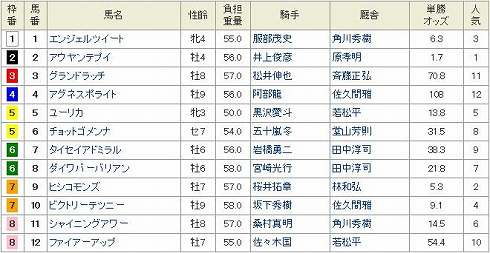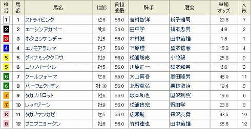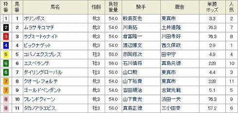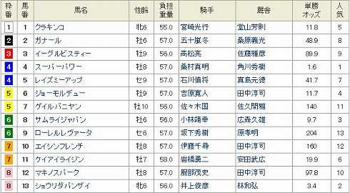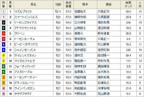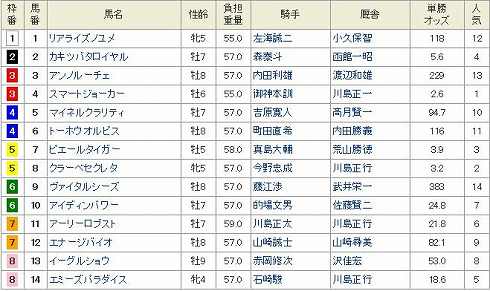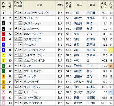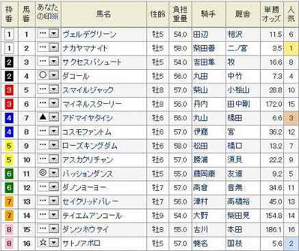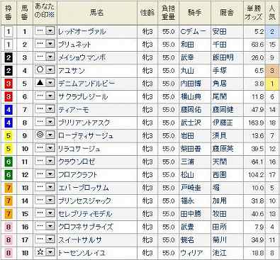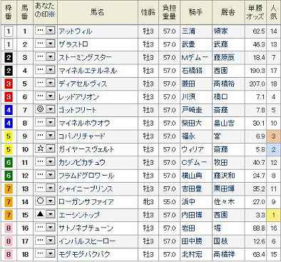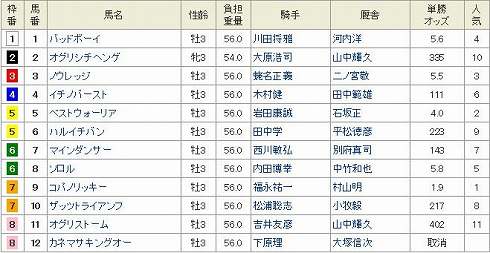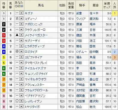 京都11R 京都新聞杯 GII競馬予想を携帯で(無料) (C)ブログパーツ提供:競馬予想D/開発:競馬インジケータ指数 ダービーへ向け東上最終便 ◎ 1 マズルファイヤー (3番人気 14.1倍)巨漢ですが前にも行ける。前走皐月賞は差しに回ったが垂れずに0.9秒差7着と健闘した部類だと思う。面子落ちのここは勝負になりそう。 〇 11 ハッピーモーメント (8番人気 35.8倍)京都外回りでこの距離は向きそう。500万下でずっと人気して負けているのでGIIのここは急激に人気を下げた。 ▲ 10 ライジングゴールド (5番人気 18.2倍)前走2400mスローの上がりだけの競馬でしたので33.3秒できても3着が精一杯でした。勝ち馬は究極の32.8秒でこれはあまり参考にならないか。距離は良さそうだし頭角を現しそうな馬。 注 13 シンネン (10番人気 50.5倍)出遅れた前走スプリングS9着大敗は仕方なし。この距離でスムーズに追走できればまだ見限れない。 △ 5 キズナ (1番人気 1.3倍)毎日杯のメンバーレベルに疑問は残るがあっさり突き放した内容は良かった。超良血なので無視はできないが。 △ 4 アクションスター (6番人気 25.9倍)末脚はここに入ると上位だがデビューからずっと馬体減なのが気になる。少し間隔が開いたので戻っていたらもう少し評価を上げたい。 (注) 人気は更新時の単勝オッズです。 買い目 本線 3連複 BOX (1.5.10.11.13) 30.9~1875倍 押さえ 3連複 2頭軸 (1.4)5.10.11.13(4.5)10.11.13 25.3~670倍 ぽちっとよろしくねにほんブログ村にほんブログ村