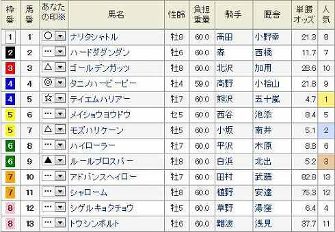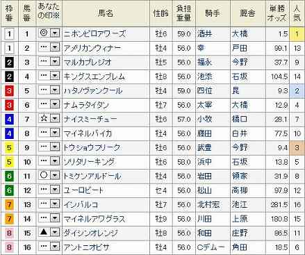 門別11R コスモバルク記念 〔H2〕ダート1800m 発走20:40園田 兵庫大賞典は6番人気◎5ダイナミックグロウが狙い通り3着に頑張ったのだが六甲盃を制したエリモアラルマが重賞を連覇した。これノーマークで万券を逃した。イタイ・・・ ラスト勝負道営古馬勢の重賞で好メンバーが揃った。開幕間もないので休み明けがほとんどです。仕上がり具合によって着順も大きく変わりそう。馬体重大幅増もおりひと波乱ありそうで楽しみな一戦です。 ◎ 12 ショウリダバンザイ遠征では結果が出ないが地元ではまだやれるだろう。休み明けで万全ではないがこのパターンでも力は出せるはず。牡馬をひと蹴りしバンザイか 〇 8 ジョーモルデュー転厩緒戦を飾った昨年の覇者。それほど勢いはないがこの距離はいいはずで。 ▲ 6 グランドラッチ中央在籍時は1200m専門で交流重賞でも勝ち負けしたほどスピードは上位。距離課題だが一発秘める。 ☆ 9 ハタノゼフィロス中央500万級から移籍し地味だがずっと好走している。相手もエース級のモエレビクトリーなどで門別の水が合ったのか怖い1頭。 △ 5 ビューティーリヨ勝つまではないだろうがうまく乗れれば馬券圏内に。 △ 1 ダイワバーバリアンビックリの移籍です。実績が他と違いすぎる。休養長くどこまで仕上がってるか疑問ですが新天地での成功を祈りたい。やはり1番人気になったので押さえまでですが。 △ 13 クラキンコもう往年の力は常に発揮できないが、年に数回さすが実力馬と思わせる時がある。でも今回は太め残りか。 本線 3連複 BOX (6.8.9.12) 押さえ 3連複 2頭軸 (8.12)1.5.13(9.12)1.5.13(8.9)1.5.13 ぽちっとよろしくねにほんブログ村