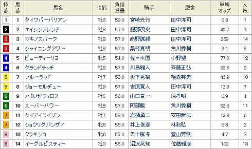 東京10R 日本ダービー GI芝2400m 発走15:403歳オープン (国際) (指定) 18頭 3歳頂上決戦の時が近づいてきた。1着賞金2億円と勝てばまさしく宝くじに当たったかのような金額です。 各競馬場で大レースを観戦してきたが、GIではこの日本ダービーとオークスは観戦したことがないです。あとすべてのGIレースはあるのですが・・・それには訳が。我が愛馬が出走した時に行こうと決めてるからです。一生ないかもしれないので、その時は・・・まだ考えてないですでも一生に一度は現場で観戦しようとは思っています。 さてダービーですが重賞3連勝中の2冠馬の評価が低いですね。通常なら1.5倍くらいの断トツ人気になるはずなんですが。 昨日の大相撲の白鵬-稀勢の里の全勝対決。勢いで大関かなとも思ったのですが、横綱が底力を見せて勝った。本当の一流は本気になるとさらに一段ギアがあるみたいでした。 何でも白鵬が歩いた後の足跡はわだちができると言われています。普段から寝る時以外は地に親指を付けて歩いてるということです。「1日、2日で誰もまねできないよ」と本人がコメントしてるように自分で作り上げた足腰。これぞ大横綱と感じさせられます。 競争馬も一流にはギアがもう一段あるはずなんですよね。でこの頂上決戦で見せつける。こんな図式です。 本命は迷わず◎ 8 ロゴタイプこの勝負強さは大舞台で活きるはず。どんなレースでも柔軟に対応できまさしく横綱級か。白鵬ももとは80kgで入門している叩き上げ。この馬もデビュー当時は今ひとつでしたが、別馬になっている。異色ローエングリンも血の魅力だ。(母父にはきっちりサンデーサイレンスが入っているが)MからCデムーロに変わったのとないとは思うが超スローになればどうかだが3着は外さないとみた。 〇 17 レッドレイヴン休養明け青葉賞1.8倍をもう忘れたのかな。あの時は異常人気で買わなかったのですが、明らかに太め残りと入れ込み。叩いて一番変わりそうで、また入れ込まないとは限らないが人気も10番人気と全くなくなりおいしいオッズになっている。 ▲ 5 メイケイペガスター皐月賞は最後方から手遅れの追い込み。上がりはNO.1だがあれでは馬券にならない。共同通信杯の後、若葉Sまで使っていたので皐月賞では切ったが今度は万全で臨めそう。決め手あるので一発怖い。 ☆ 2 コディーノ勝ちきれてないがまだ馬券圏内を外したことがない。インパクトはないが世代ではトップクラスなのは間違いない。 ヒモ△は買いたい順に9 エピファネイア 良血見限れず16 ペプチドアマゾン 好位から粘り強い10 タマモベストプレイ 穴党の推しが多いので評価下げた4 クラウンレガーロ 人気ないが大差なく1 キズナ ここであの芸当は通用するか?11 テイエムイナズマ 大穴で 買い目 本線 3連複 BOX (2.5.8.9.17) 押さえ 3連複 2頭軸 (8.17)1.4.10.11.16(5.8)1.4.10.11.16(2.8)1.4.10.11.16 ぽちっとよろしくねにほんブログ村にほんブログ村