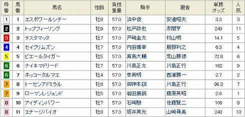 船橋11R かしわ記念 JpnIダート1600m 発走16:20 GWの締めくくりはGI かしわ記念 春のダート統一マイル王決定戦にふさわしい好メンバーで楽しみです。 いずれにしても中央馬は5頭中4頭がGI馬。もう1頭も重賞3連勝中の勢いのある4歳馬で一線級が勢ぞろいし強力すぎて地方馬は太刀打ちできないでしょう。 配当は安くなりそうで買い方に工夫が必要か。 ◎ 1 エスポワールシチー地方のマイルGIでは未だ3着を外したことがない。例外は東京で行われた南部杯の4着だけです。9歳になり衰えを心配したが、フェブラリーSでもこの馬の底力が見れたし、過去3勝と相性のいいこのレース。好枠を引き逃げ残り濃厚。 〇 7 ホッコータルマエ勢いのある4歳馬でアンタレスSでもJCダート覇者のニホンピロアワーズを2kgの差はあったとはいえ完封した。若干距離が短いように感じ〇にしたが力差はもうないはずで。 ▲ 9 ローマンレジェンド帝王賞の叩きだと思うが、すでに今後の活躍が約束されたかのような成績。完璧に仕上がってなくとも勝負になる。 ☆ 3 テスタマッタ気性に難があるタイプだけに嵌れば豪快だがリスクもあるので。 △ 4 セイクリムズンカンカン泣きしてたが57kgなら能力を発揮できる。やはりマイルは長いがどんぴゃの展開なら馬券圏内に。 △ 8 トーセンアドミラル地方馬はかなり苦しいが中央実績があり先行力があるこの馬を少しだけ。 本線 3連複 2頭軸 (1.7)3.4.9 押さえ 3連複 2頭軸 (1.9)3.4.8 3連複 1-7-81-3-4 ぽちっとよろしくねにほんブログ村