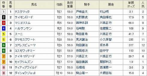 浦和11R さきたま杯 JpnIIIダート1400m 発走16:40 JRA勢強力で本命戦濃厚。3着あたりにヒモ穴が来てくれたら。 ◎ 10 セイクリムズン57kgなら勝ち負け必死。人気でも。 〇 11 ティアップワイルド地方なら1400mでも。番手でも問題なし。 ▲ 1 テスタマッタこの距離なら折り合いも付くでしょう。一発秘め。 ☆ 5 スーニ体調次第でまだやれる。58kgなら動けても。 △ 9 ナイキマドリード地方から3着があるとすればこの馬か。 △ 12 ダイショウジェット展開嵌れば連下に注意。 本線 3連複 2頭軸 10.11(1.5.9.12) ぽちっとよろしくねにほんブログ村