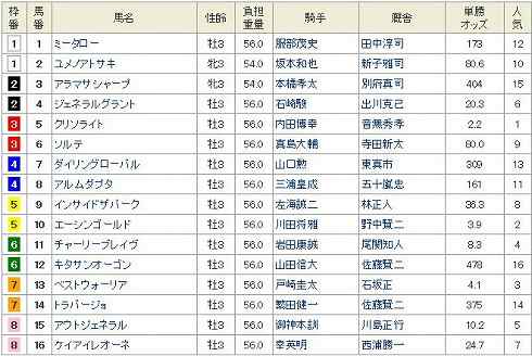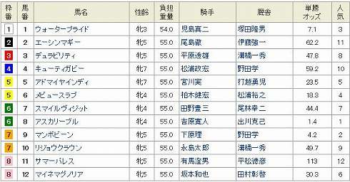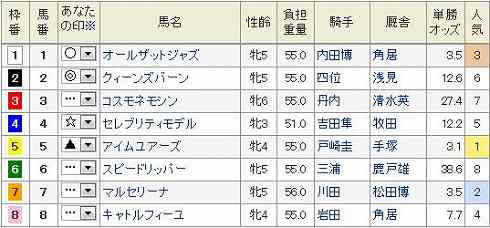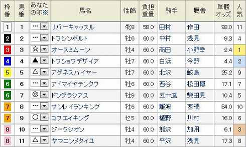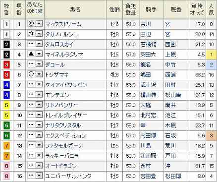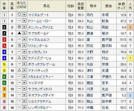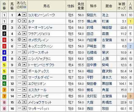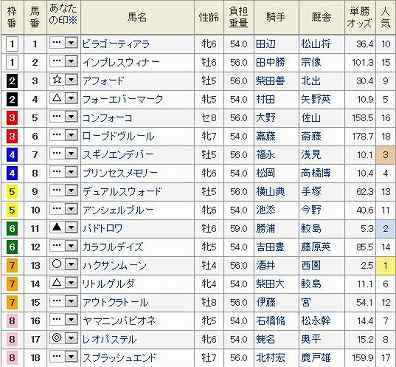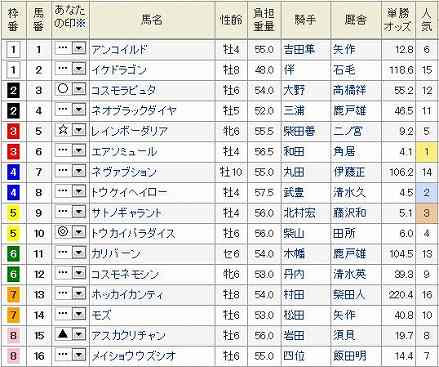 中京11R 関ケ原S 芝2000m 発走15:353歳上1600万下 混 (特指) 定量 18頭 皆さんこんにちは まだ気温が上がらないうちに用事を済ませ、帰ってからお台場合衆国の生放送(関西は放送なしだけど)を観ましたNEXT AKB48ライブとずっと字幕出てるんだけど、一向に始まらない。引っ張るだけ引っ張ってようやくAKB48ライブ。1曲目の恋するフォーチュンクッキーの途中で番組終了となんともふざけた番組でした。お台場合衆国のただの宣伝番組だった。 気を取り直して競馬。今日も重賞はなく、準OP中京の1鞍で勝負します。 ◎ 13 ジェントルマン現級勝ちがありこのクラスでは地力上位。 〇 16 マイネオーチャード牝馬で夏に強いイメージ。前崩れなりそうで展開向く。 ▲ 12 ロードエアフォース休養明け、昇級、初距離と三重苦だが、逃げの形に持ち込めれば。 ☆ 7 ニューダイナスティ現級勝ちし、再度同条件でいかにも有利だが同型も多く展開次第。 ヒモ△は3 マイネジャンヌ この牝馬も夏馬のイメージ5 ホッコーガンバ 思い切った逃げで14 マイネルガヴロシュ 嵌れば17 トーホウストロング 折り合いつけば 買い目 本線 3連複 BOX (7.12.13.16) 押さえ 3連複 2頭軸 (13.16)3.5.14.17(3.13)5.14.17 ぽちっとよろしくねにほんブログ村にほんブログ村