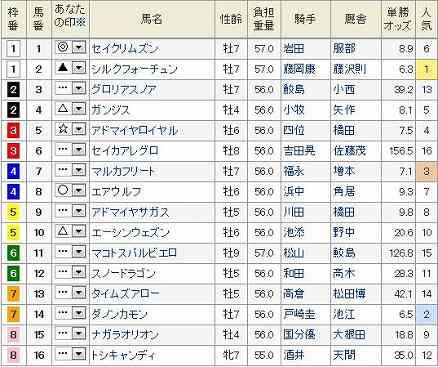 中京11R プロキオンS GIII ダート1400m 発走15:353歳上オープン (国際) (指定) 別定 16頭皆さんおはようございます ◎ 1 セイクリムズン今期は調子良く1400mなら中央でも。 〇 8 エアウルフOP特別で力を付け重賞初挑戦。メンバーは骨っぽいが壁はないとみた。 ▲ 2 シルクフォーチュン1400mまでなら嵌れば強烈な末脚を発揮。展開と折り合い次第で頭まで。 ☆ 5 アドマイヤロイヤル相手なりに走れここでも大崩れはなさそう。 ヒモ△は4 ガンジス 立て直した効果はありそう10 エーシンウェズン この距離で改めて 買い目 本線 3連複 BOX (1.2.4.5.8) 押さえ 3連複 2頭軸 (1.10)2.4.5.8(2.10)4.5.8 ぽちっとよろしくねにほんブログ村にほんブログ村