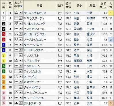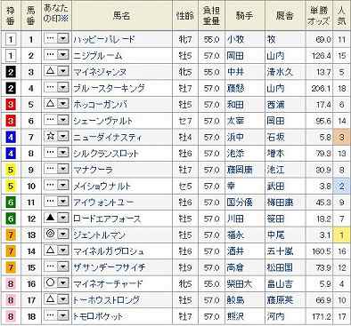 中京11R 豊明S 芝1400m 発走15:353歳上1600万下 混 [指定] ハンデ 18頭ここはOPで実績のある降級組と勢いのある昇級組にこのクラスで頭打ちしている各馬がおりハンデ差が大きい。荒れる要素もあるので、点数は多くなるが高配当を狙いたい。 ◎ 3 サイレントソニックこの距離はぎりぎりで甘くなる傾向だが、折り合いつけば決め手あり末脚爆発も。 〇 6 ノーブルジュエリー牝馬ながら大崩れの少ないタイプで、好位から競馬でき最後までしっかりしている点もいい。 ▲ 18 ラトルスネークこのメンバーで昇級戦ながら56kgは見込まれたが1400mは得意で。 ☆ 13 オリービン準OPでは滅多に見ない58.5kgの極量だが、OP勝ちに重賞でも実績があり仕方ないか。取捨は難しいが人気馬は1000万下からの昇級組なので、このハンデでも力上位は明らかですから無視はできない。 ヒモ△は1 プリムラブルガリス 古馬をひと蹴りした前走好内容で53kg魅力5 ホーカーテンペスト 現級勝ち実績もハンデ微妙10 シゲルスダチ OP実績馬の降級で16 オールブランニュー 軽量でうまくいけば3着候補 買い目 本線 3連複 BOX (1.3.6.13.18) 押さえ 3連複 2頭軸 (3.6)5.10.16(3.18)5.10.16(3.13)5.10.16(6.18)5.10.16(13.18)5.10.16 ぽちっとよろしくねにほんブログ村にほんブログ村