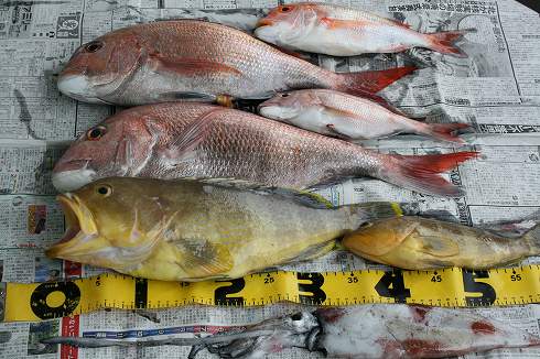 今日は船釣り。小倉から山口県の角島沖 タイラバです。天気 中潮 凪地元の釣り仲間の皆さんと合同でチャーターしました。6時すぎに出港。ベタ凪の寒くも暑くもない快適な航海でまっしぐらで北上し、遠くに角島大橋を望み、1時間40分ほどでポイントに到着。潮止まり前で流れも緩やかなのでしばらくは我慢かなと思ってるとそんな中いきなりさんがやってくれましたさんのやりとりを船長と見てるとこの真鯛デカいやんと・・・時折じりじりドラグがなり、締め込みもありながらゆっくり慎重に。ようやく上がってきました。ナイスで綺麗な真鯛ちゃんやったぜさん船長計測62cmでした。一番経験のないさんの一撃、これぞタイラバ会心の笑顔で自己最長寸おめでとうございます私は潮の緩い時は水深80m前後のボトム留め置きのイカメタルでヤリイカちゃんGETパラソルまではいかないがまずまずのヤリイカちゃんを連続で5杯。そろそろ夜焚きイカシーズン突入を予感させてくれました。また楽しみや潮が1ノットあまりいき始めるとパラ投入。そろそろ真鯛タイムかなボトムから3巻きでいきなりガツガツ喰らいついてきました。引きを楽しみながらやり取りし、50cmの真鯛ちゃん自作の仕掛けで釣れて嬉しかったです。さらに56cm追加もう1枚は35cm程度のかわいい真鯛ちゃんでした。(画像なし)外道はこんなデカいアオナやレンコイトヨリに小さいアオナなど多数釣れました。私の釣果真鯛35・50・56cmヤリイカ5杯アオナ・イトヨリ・レンコ多数2号くんもくんも真鯛ちゃん釣れて全員安打肩の荷が下りました。良かったぁ釣り仲間さんたちは離れてたので撮ってません(画像頂きました)が3Kgほどのヤズや真鯛ちゃんや甘鯛などなど・・・各種釣れたので釣り仲間さんのミッション海上海鮮丼釣れた鯖・鯵・ヤリイカ・レンコ・イトヨリなど捌いてご飯炊いて作ってきたタレに絡ませ海鮮丼を全員に振舞ってくれました。作ってくれたご当人ありがとうくん&アシストのさすが和食職人さん、あんたたち凄いよ海上で食べる海鮮丼は何倍も美味かったね今回は船長さんも優しかったし、地元釣り仲間の皆さんのおかげで楽しい釣りができました。+クーラーにもたくさんいろいろ釣れたね来年も合同で行きたいですね。お世話になりました。 ぽちっとよろしくねにほんブログ村