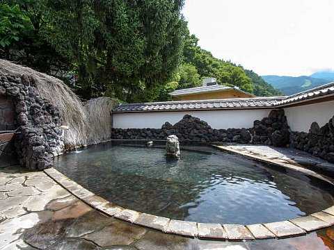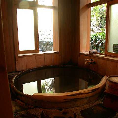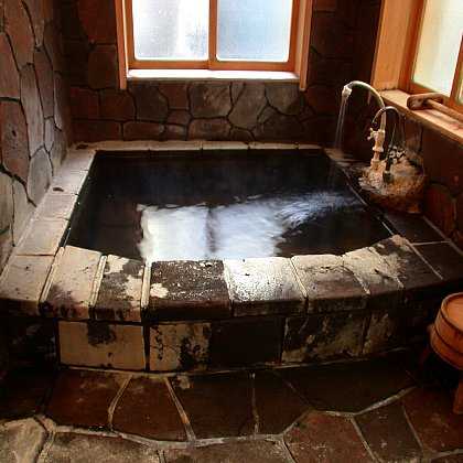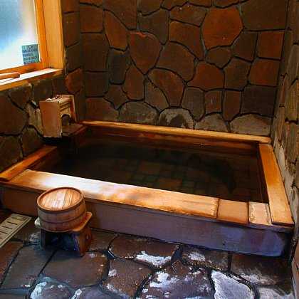 子安の湯 ・・・壁と床は浅間石、浴槽の縁は木曽の木です。