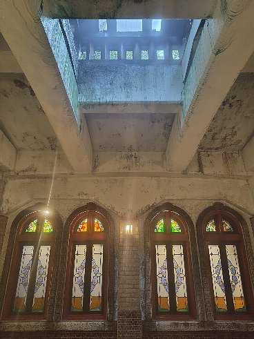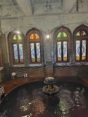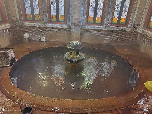 ローマの浴場をイメージしていて中央に噴水があり、ステンドグラスが異国情緒を醸し出しています。
