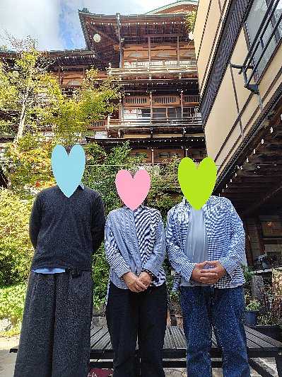 10時前、支払いを済ませて、 旅館前で3人の記念写真 を撮ってもらいました。