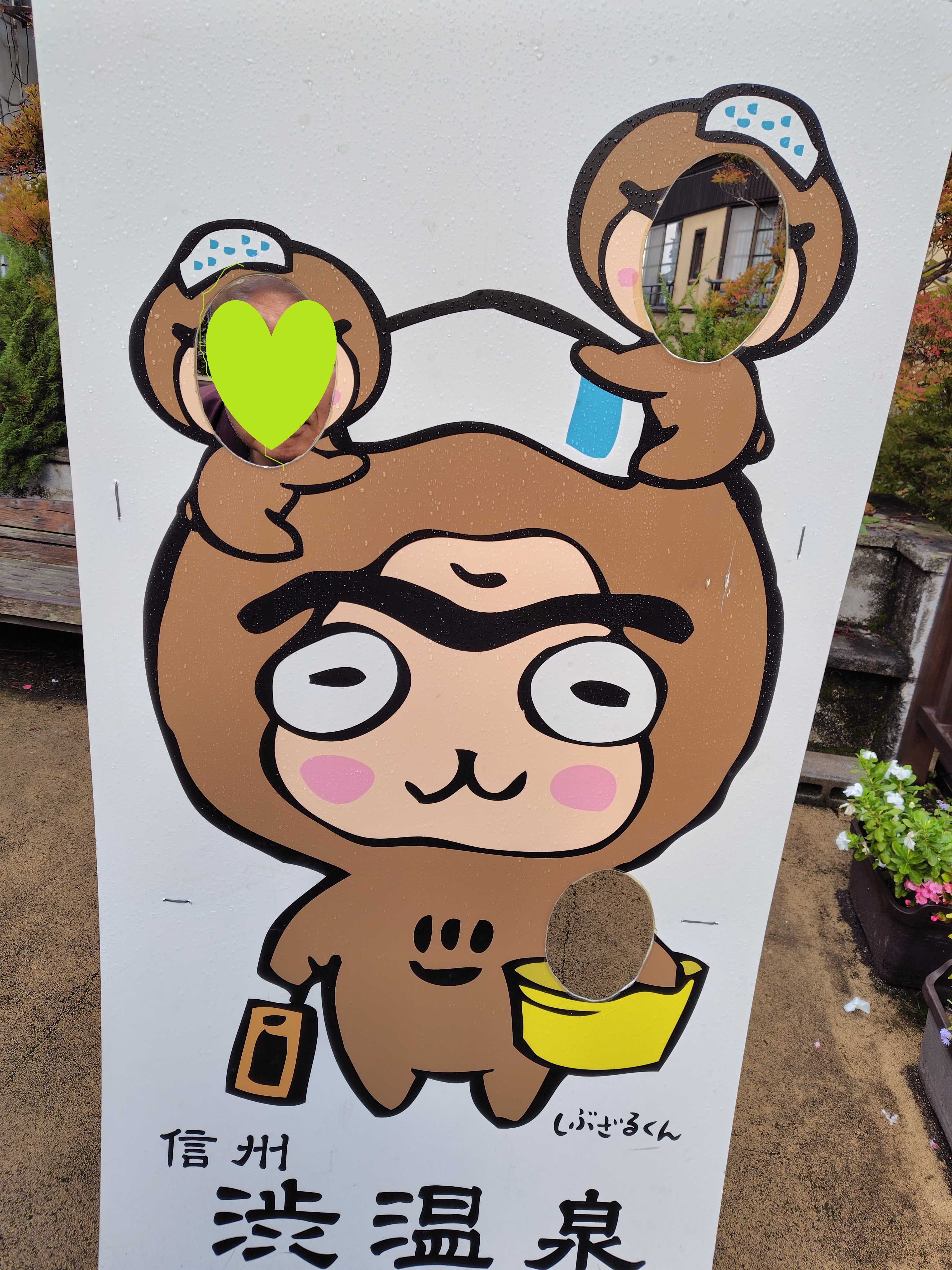 渋温泉のマスコット 「しぶざるくん」 と記念写真。