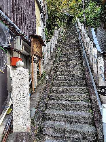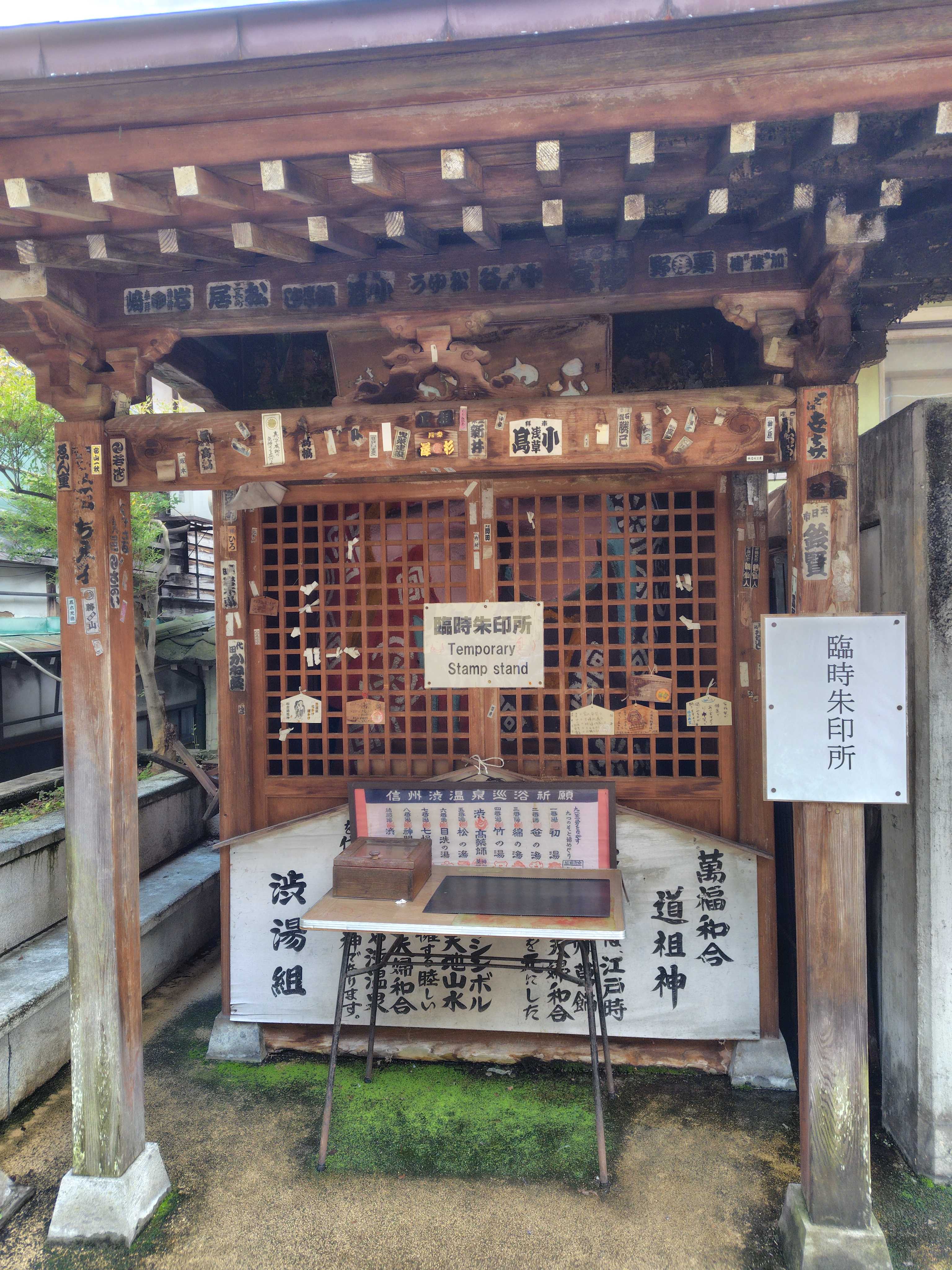 9つの外湯を制覇したのち、ここで満願の報告をして願い事を祈願するのですが、石段を昇るのがかなりしんどそうなので下から手を合わせて、石段の登り口にある「臨時朱印所」で 「祈願印綬」というスタンプを手ぬぐいに押しました。 重ねて手抜きしたのでご利益あるかなあ??