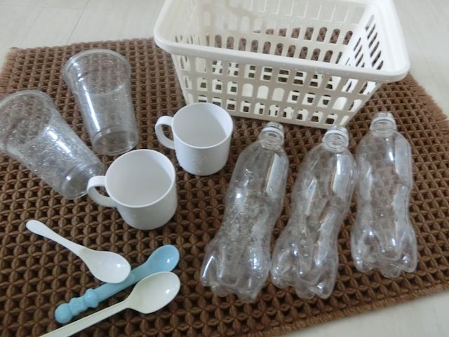 ここ沖縄は、2週連続の週末台風でした。長女の幼稚園の運動会も延期に。運動会の延期に伴って振替休日も延期(> <)振替休日を乗り切る為にかなり前もって調整してきたのに。。。共働き夫婦にとっては振替休日の変更はかなり痛いです(; ;)+++さて、今回の台風はどうやって乗り切ろうかと考え。。。ごっこ遊びが大好きな娘達なので、色水遊びのジュース屋さんごっこを提案。すぐに乗ってきました♪ しめしめ ( ´艸`)ペットボトルの空に絵の具で作った色水 & プラスチックカップをいくつか準備。最初はいちごジュースやレモンジュースを注文してウォーミングアップ。その後、「ぶどうジュース」「オレンジジュース」「メロンジュース」を注文♪私が準備した色水は、赤・黄・青の3原色+白の4色だけ(笑)「注文したジュースができたら呼んでね〜♪」と告げて、私はキッチンで聞き耳を立てながら作業^^冷蔵庫の仕切り板やバスケット類を洗いました。時々様子を見に行くと。。。頑張って調合中♪しばらくすると「オレンジジュース出来たよっ〜!!ヾ(o´∀`o)ノ」試行錯誤してたどり着いたようです^^2人とも集中して遊んでいました。1時間後にはすごい惨状でしたが(^∀^;)まぁ、これを想定して浴室にしたんですけどね(笑)子育て奮闘中~♪ぶどうジュース、(ちょっと微妙な)メロンジュースも無事完成♪色の面白さを楽しんだようでした^^+++そんな浴室に現在ぶら下がっている物。試供品のボディソープ。使おう使おうと思いつつ、いつも体を濡らした後に思い出すので最近は使いたい試供品は浴室に吊り下げてます。これならさすがの私も忘れません^^次の週末は晴れますように☆最後までお付き合いいただきありがとうございました☆☆読んだよ〜のしるしに応援の1クリックいただけると嬉しいです (*´∀`*)にほんブログ村