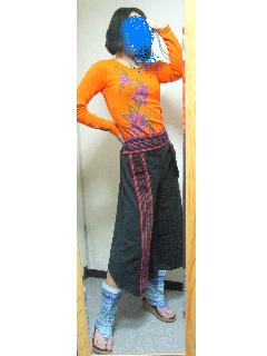 こないだ買ったモンブーツサンダル、そういえばこれと合わせたかったのを思い出しました。寿由紀ちゃんありがとうオレンジロータス、モン族パンツで。このパンツは丈が中途半端なのでふくらはぎが~~~~。で、このブーツサンダルなら♪ちょうどぴったし~。腰で履くと以前マライカで買ったパッチワークのワンピの縫い目が縄になってるのが好きで綾凛さんから交換で今度はロングスカート♪落ち着いたパッチワーク、ラブです。綾凛さんいつもいつもありがとう。後ろから画像・・・・・。断念!難しい!姿勢停止できない落ち着きの無さが災い?またチャレンジしてみよう・・・。パッチワークブームがラップマックさんからやってきた