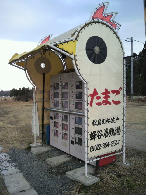 先日やっと立ち寄ってみました!!いつも、利府のグランディの近くのパン屋さんに行く途中、いつも見かけるんです。気になる自販機を!!車で走っているとこの形のものが見えるんです!!自分で運転しているときは、わき見運転になってしまうので、なんだろうと思っていましたが、助手席に乗っているときには、とっても気になっていました(^^♪でも、またあとでと思っていると下りは通り過ぎてしまっていつも買えずじまいでした。今回は、思いきって立ち寄ってみました。そこはたまごだけを売っている自販機でこのようなたまごが入っているんです!!お金を入れて(11~14個入りで300円でした)自分のほしいたまごを選んで扉を開けて受け取るんです。たまごの種類はさくらたまご ほんのり桜の色に似ています(^^♪やっぱり、これだけ新鮮だとこの食べ方しかないでしょう(*^^)v