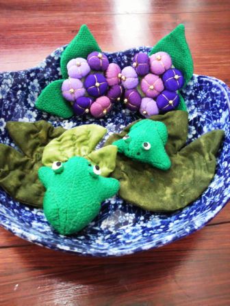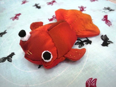 今度は出目金とぼけた出目金作りたいとずっと思っていました。いろいろ作っているうちにやっぱりつくりたい・・・・とふつふつと製作意欲が湧いてきて製作開始生地は前にほどいていた雨コート裏がしみだらけで着られなかったものをリサイクル出来ましたよとぼけ顔のでめきんが もう少し写真より実物の方がとぼけた感じが出ているのですが、でも、なんとなく感じ取ってくださいね 本当は金魚鉢で泳がせたかったのですが、とりあえず清涼感を持たせてということでこのようにディスプレーやっぱりちょっと狭い感じがしますが一匹じゃさみしいので二匹で・・・でも、本当は三匹製作したのです