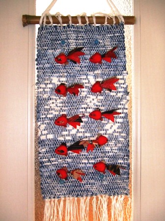 毎日とてもとても暑い日が続きますが、皆さんどのようにこの夏を過ごしていますか?私は今一人家にいるので扇風機で我慢していますが、やっぱりエアコンに手が伸びそう・・・・その中、やっと出来上がりました。今回は、7/15に裂き織の体験会に参加してミニテーブルセンターをつくったのですが私はつるし金魚を下げてタペストリー(ミニ掛け軸)に仕上げてみました。横18センチ・縦35センチのサイズです。この金魚達も全長6センチと布を張るのに苦労しましたが、出来上がって飾るととてもマッチしていて満足です。