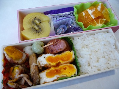 昨日は部活もお休みで1日宿題に追われていたお嬢さん。私は朝から外出予定だったのでお昼用に残り物でロースツビーフサンドを作ったのにそれを朝イチで食べつくされ・・・ 仕方がないからお昼はカップうどんでも食べてと言い残し出かけました が、帰ってきたらうどんを食べた形跡はあるのにキッチンにうどんスープが。。。 ~湯のまま食ったのか?(滝汗) なかなかワイルドじゃないか!~と驚いていたら、スープを落としてどこか分からなくなったから夕飯用のカレーをかけて食べたんだと。。。 (それはそれでワイルドだ 汗)ある意味豪快な性格のお嬢なんだわ・・・さて、今日からは普通に部活があるのでお弁当作りましたよゆでたまご ・ ウィンナー ・ ミートボール ・ 3色串天 ・ キャンディーチーズハウスみかん&キウィ塾に行ってて「うどん事件」を知らなかった兄さん。。。大爆笑でした・・ 気が向いた時に。・・。・。コロン♪コロン♪ ・・モモは美味しいよね~(^_^;)モニターレポはコチラから。。。