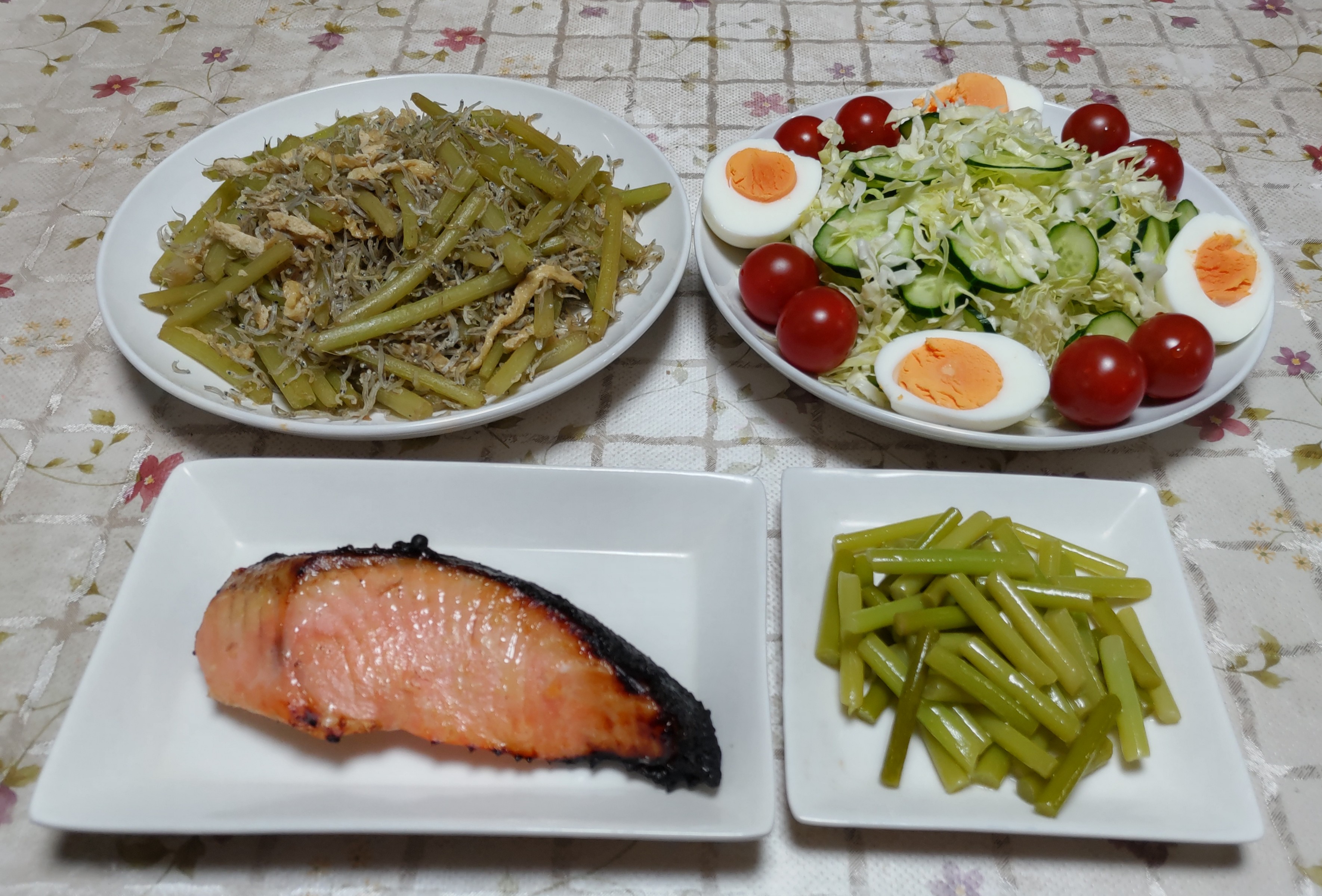 今日のごはん今日のごはんは鮭の西京漬けチリメンジャコとフキの煮物サラダニンニクの芽の漬物鮭の西京漬けは 鮭の西京漬けをグリルで焼きました。チリメンジャコとフキの煮物は 皮をむいて茹でてあく抜きしたフキをチリメンジャコと油揚げと一緒に炒めてから煮ました。フキの緑色がきれいだったので白だしを使って少しだけですが色を生かしてみました。サラダは 千切りキャベツ・キュウリ・ミニトマト・茹で卵です。漬物は サッと茹でたニンニクの芽を白だしとゴマ油で漬けました。今年のニンニクの芽はいつもより太くて良いものが採れるのでネットで食べ方を色々調べてみました。その中で気になった漬物を作ってみました。肉や野菜と一緒に炒めて食べるのも美味しいですが初めて食べる漬物も美味しいです。これもレシピを料理のファイルに追加しました。裏庭に植えてあるフキが今年はとても元気に育っています。いつもより太くて葉っぱも大きいです。期待していたフキノトウはあまり出ませんでしたがフキはたくさん出てきたので良かったです。庭のユスラウメが真っ赤に色付きました。甘酸っぱい味がします。そろそろ野鳥たちが見つけて食べに来そうです。家から少し離れたもう一つの畑に植えてある栗の木たくさんの花を咲かせています。この花からクリのイガができるのを想像できませんね。でもこの一本一本がイガになるのかな。良く見ると花は開いていなくてまだ蕾かも。栗の木が植えてある畑に今年はジャガイモと里芋が植え付けてあります。その畑に今度はサツマイモの苗を植え付けました。今年はベニハルカだけにしました。甘くてとても美味しいサツマイモです。