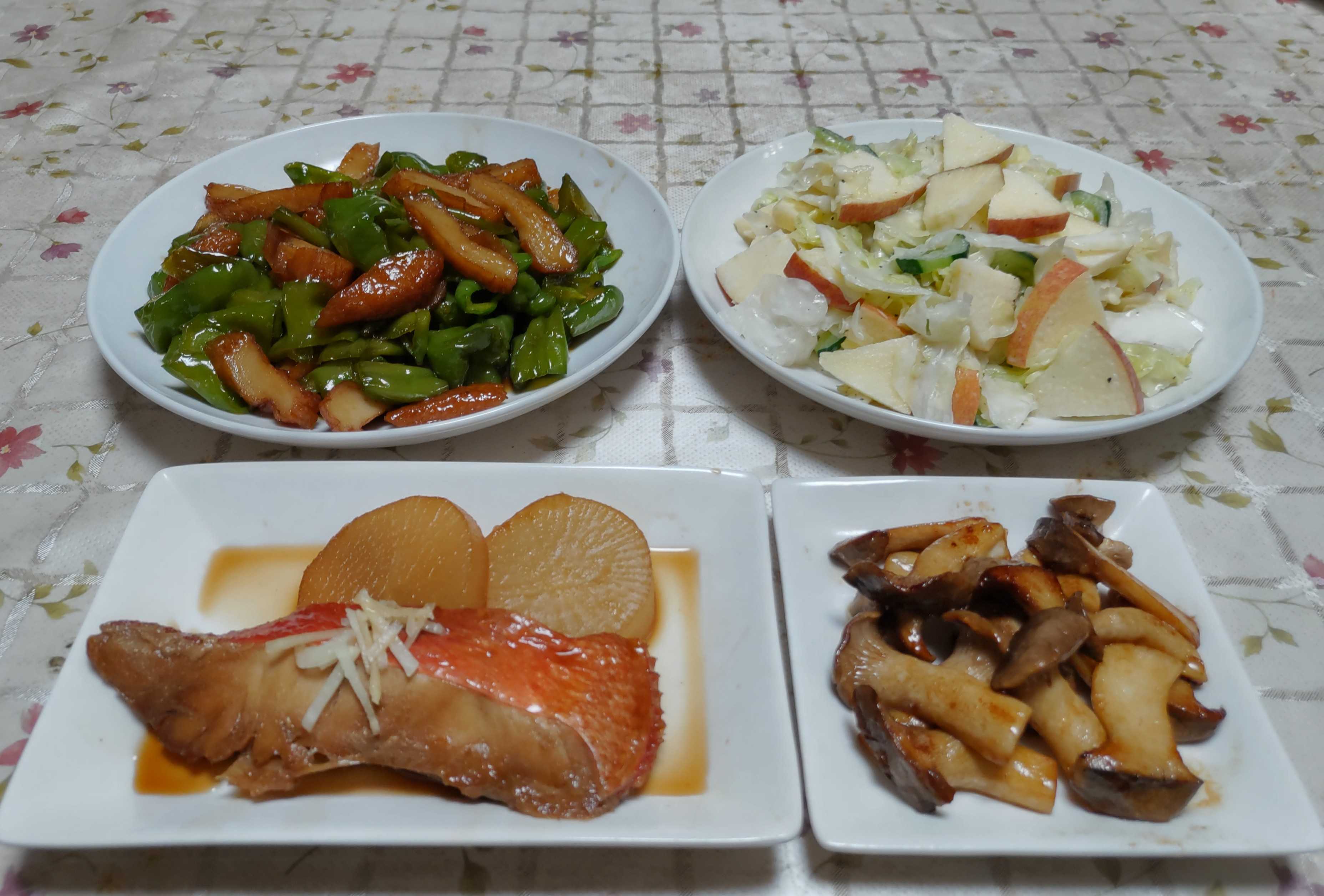 今日のごはん今日のごはんは金目鯛の煮付けエリンギのバター醤油炒めピーマンとさつま揚げの煮物キャベツとリンゴのサラダ金目鯛の煮付けは 金目鯛の切り身を煮付けました。煮汁の中に大根の輪切りも入れて一緒に煮ました。エリンギのバター炒めは エリンギをバターで炒めて醤油を少し入れました。ピーマンとさつま揚げの煮物は ピーマンとさつま揚げを甘辛く煮付けました。煮り物と一緒に煮ると良いお出しがでて美味しいです。キャベツとリンゴのサラダは 塩で軽く揉んでしんなりさせたキャベツとリンゴを酢・砂糖・胡椒・マヨネーズで和えて作った甘酸っぱいサラダです。猛暑の影響で栄養が行き届かなかったせいでピーマンはこんなクシャクシャな形のものが多いです。見た目は悪くても味は変わらず美味しく食べられます。今年も収穫した栗で渋皮煮を作りました。利平と言う大きめの栗です。きれいに仕上がったものは冷凍保存して形が崩れたものを食べています。鬼皮を剥く時に渋皮にキズが付いたものは栗ご飯にしました。まだ木にイガが残っていて収穫できるので次はどんな食べ方をしようかと考えています。隣市にある美味しいパン屋さん「サンセリテ」へ食パンとバケットを買いに行きました。朝8時オープンのお店で開店前から行列ができています。行ったついでにお店の隣の土地に用意してあるテーブルでその日の朝食用に買ったパンとアイスコーヒーで朝食にしました。青空の下で食べる焼き立てのパンは美味しかったです。買って来た食パンとバケットはスライスして冷凍保存して時々朝食に食べています。畑に定植したキャベツです。順調に育って大きくなっています。同じ日に畑に定植したブロッコリーも同じように大きくなっています。畑に直播きしたホウレン草もきれいに発芽してくれました。マルチの穴に5粒ずつ蒔いてあります。玉ねぎもきれいに発芽してくれました。白菜の苗も畑に定植して 種まきをした他の野菜たちも次々と発芽してだんだん畑が賑やかになってきました。