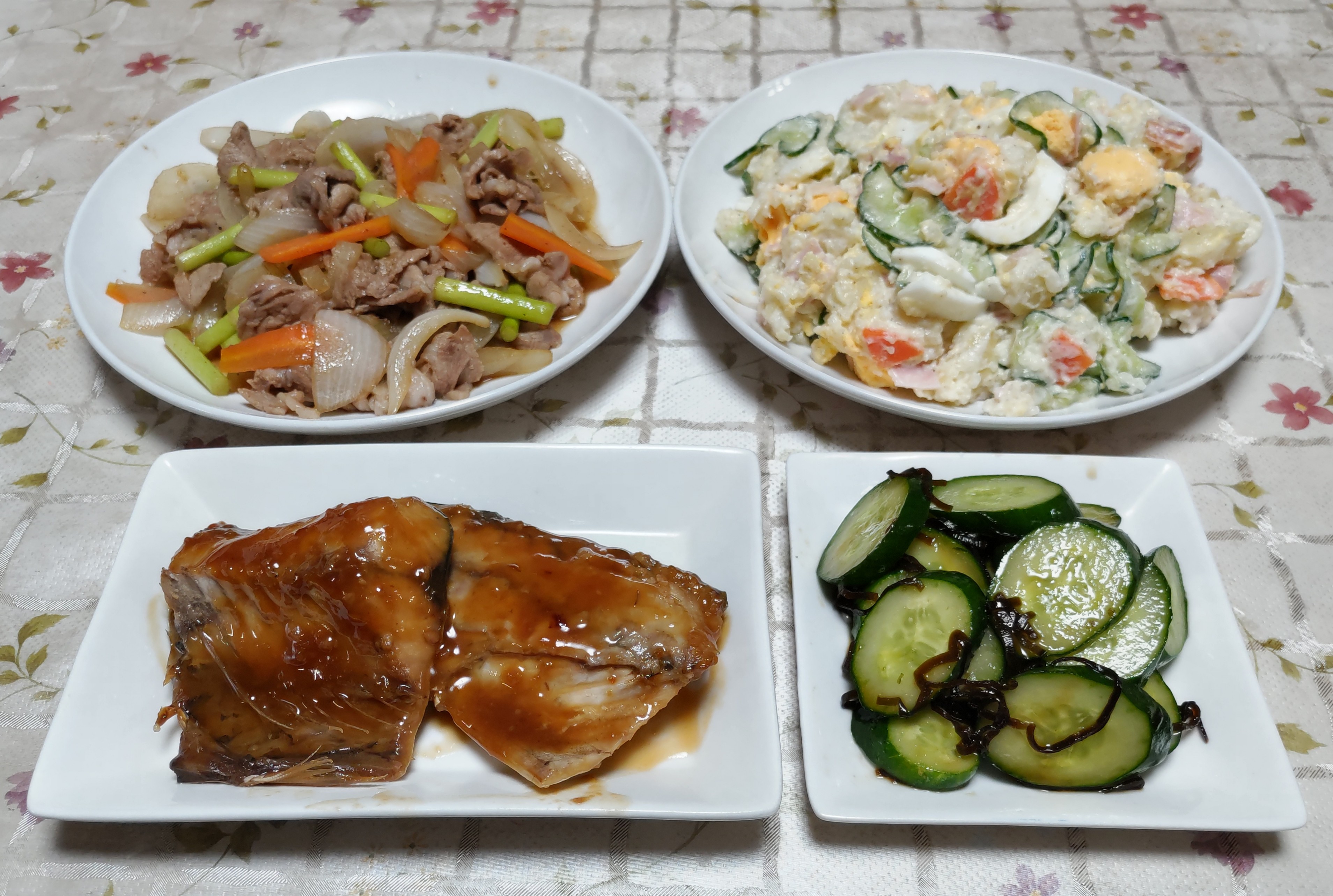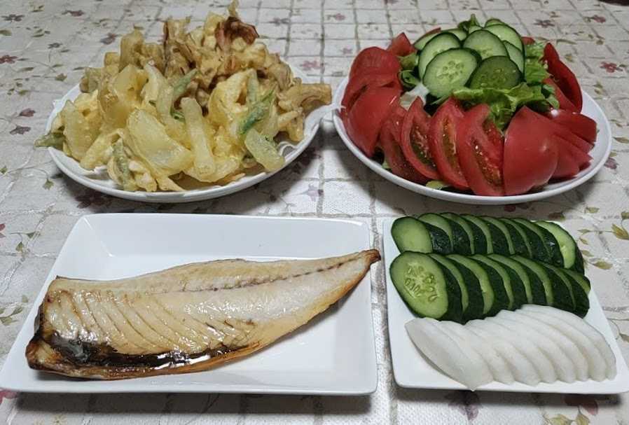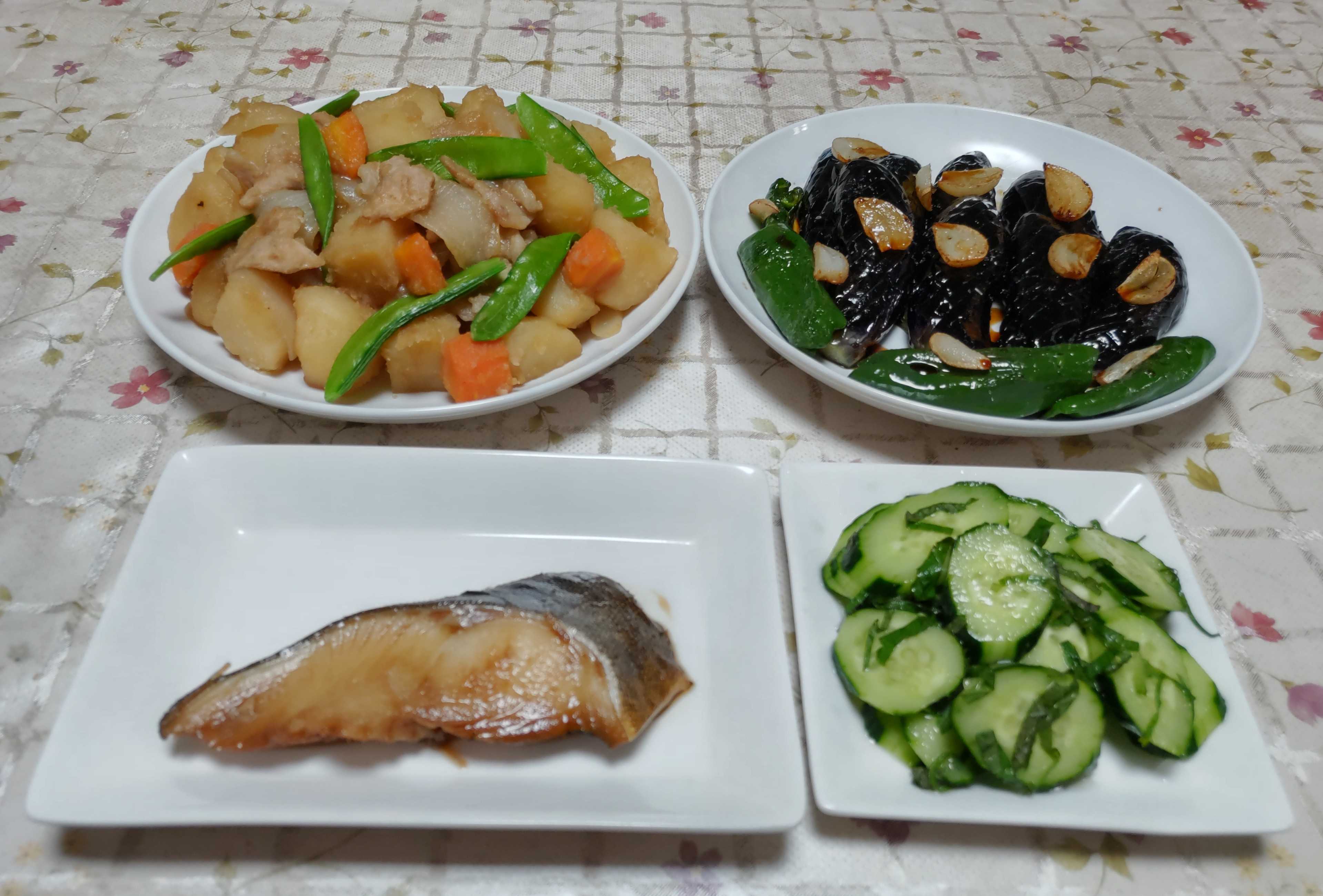 今日のごはん今日のごはんは生サバの味噌煮ニンニクの芽と新玉ねぎの炒め物ポテトサラダキュウリの塩昆布和え生サバの味噌煮は 生サバを二枚におろして味噌煮にしました。気が付いたら煮詰めすぎて煮汁がこってりしてしまいました。それはそれで味がしっかりして美味しかったです。ニンニクの芽と新玉葱の炒め物は ニンニクの芽と新玉葱と豚肉をニンニクと一緒に炒めて醤油・ミリン・酒・塩コショウで味付けました。ポテトサラダは 茹でたジャガイモを軽く潰してキュウリ・人参・ハム・茹で卵と一緒にマヨネーズと塩コショウと隠し味に酢少々と砂糖少々を入れて和えました。キュウリの塩昆布和えは スライスしたキュウリを塩昆布で和えました。キュウリが収穫できるようになりました。初収穫のキュウリは曲がっていたり太くて短めだったりですがお店で買う物とはまったく違う美味しさです。ニンニクの茎からスーとトウ立ちしたニンニクの芽を収穫して食べています。香りが良く柔らかくて甘みもあり美味しいです。お肉や野菜と一緒に炒めたりスープに入れたり浅漬けにしたり 切って冷凍保存したりしています。これもこの時期しか食べられない食材です。ニンニクも葉が少し枯れてきたので収穫してみました。ちゃんと育っていました。収穫したての生ニンニクはみずみずしくて良い香りがします。今年の梅はたくさん実をつけてくれました。収穫までに風に落とされて数は少なくなりますがそれでも今年は豊作になりそうです。ジャガイモの花もきれいです。これはキタアカリの花です。これはダンシャクの花こちらはメークインの花です。それぞれ品種により少しずつ花色や花の付き方が違いますがどれもきれいです。今年初めて栽培しているアンデスレッドの花です。他のジャガイモより少し遅れて咲き始めました。きれいなお花です。赤い皮のジャガイモが楽しみです。