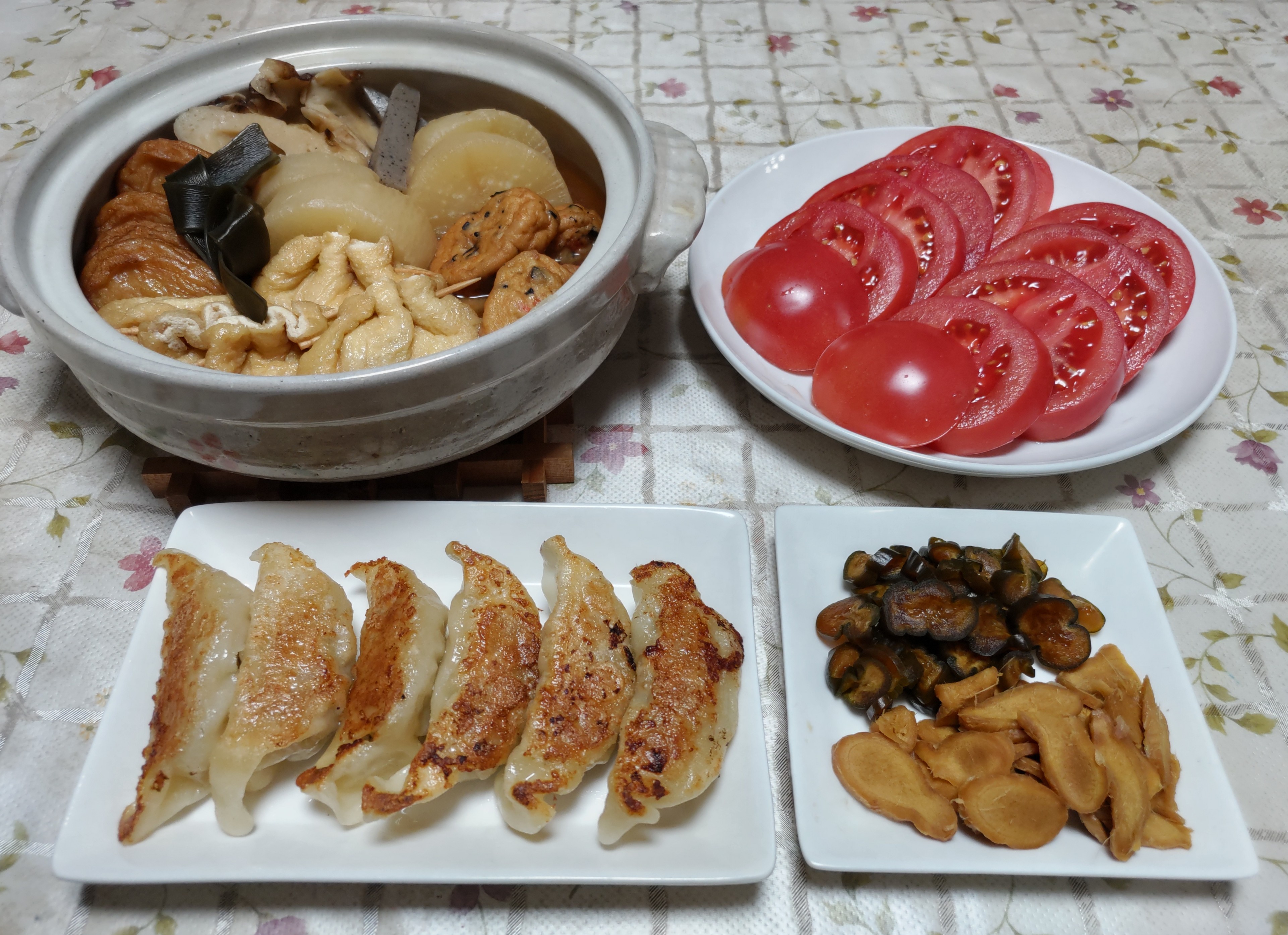 今日のごはん今日のごはんは焼き餃子おでんトマト味噌漬け焼き餃子は 満州餃子を焼きました。久し振りに満州餃子の工場近くを通ったので買って来ました。おでんは 大根・コンニャク・竹輪やさつま揚げなど練り物数種・餅巾着・昆布を入れて煮込みました。このおでんもブロ友さんの所で餅巾着入りのおでんを見て美味しそうだったので真似して作りました。冷凍保存してあるお正月のお餅を油揚げに入れて作りました。大鍋でたくさん作りテーブルの上には2人用の小さい土鍋に入れました。翌日もまたおでんです。トマトは 切っただけ。塩をパラパラと振って食べました。味噌漬けは 自家製きゅうりと生姜を味噌漬け用の味噌で漬け込んでおいたものです。味噌味がしっかり浸み込んで良い味になりました。今年も例のトマト屋さんから「トマト始まったよ」と嬉しい電話がありました。毎年家のトマトが採れるまでの間このトマト農家さんに買いに行っています。この時期にスーパーや直売所で買ってもトマトの味も香りもしなくていつもがっかりしています。ここのトマト農家さんの「収穫したての完熟トマト」は味がしっかりあって風味も良くとても美味しいんです。ご主人が美味しいトマトを作ろうと色々研究し続けているようです。お話好きのご夫婦で買いに行くと話が始まって20~30分帰る事ができなくなります。いつも売り始めるとの電話が来るのを楽しみにしています。買い始めてそろそろ20年近くになります。トマトは抗酸化作用があって体にもとても良い食べ物です。この時期からトマトを食べ始めてトマト農家さんのトマトが終わる頃には家のトマトが食べられるようになります。こうしてずっと美味しいトマトを食べられる事が健康の秘訣のひとつだと思っています。庭の蝋梅の花が次々と咲いてとても華やかになりました。蝋梅の木の近くを通るととても良い香りがしています。クリスマスローズの蕾も膨らんで色付いて来ました。花びらが開くのを楽しみに待っていますが最強寒波の影響で開花は少し遅れるかもしれません。埼玉は雪の予報は出ていませんがかなり寒くなりそうです。