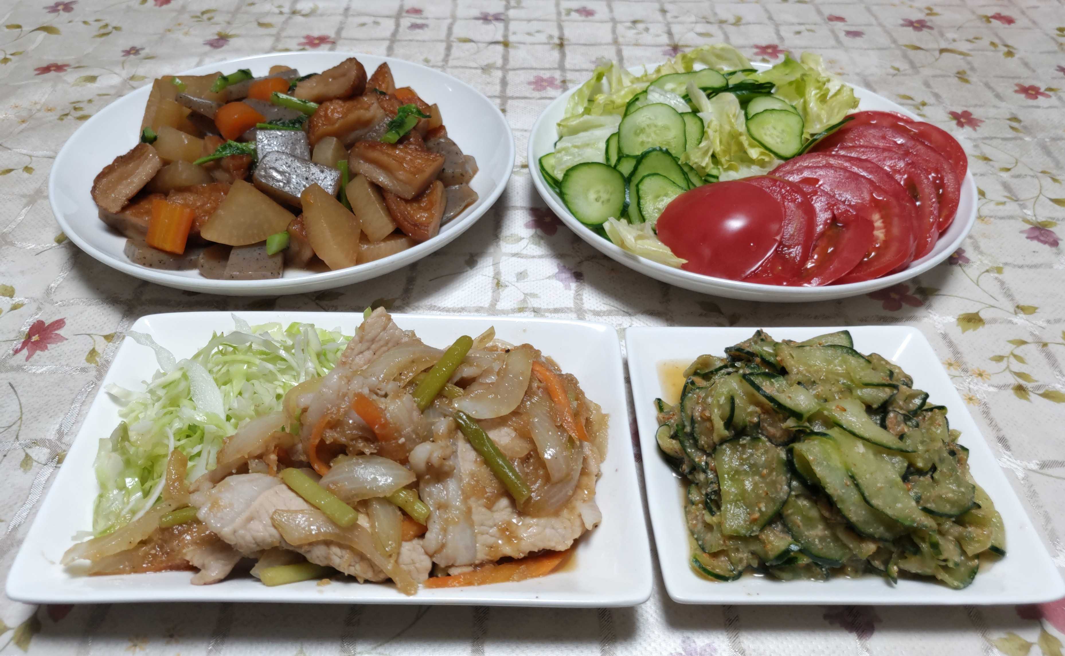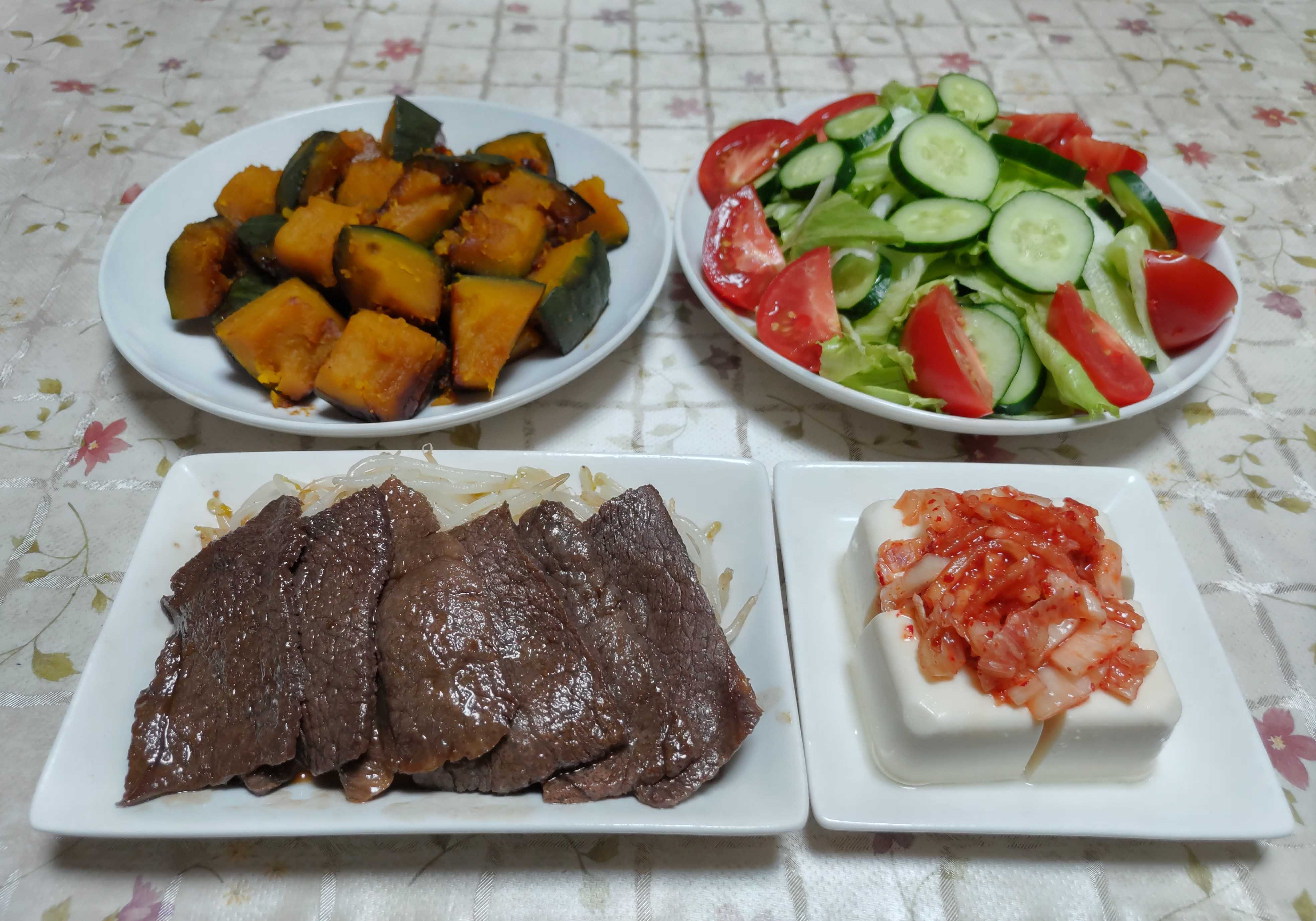 今日のごはん今日のごはんは焼き肉冷や奴カボチャの煮物サラダ焼き肉は 焼き肉用牛肩肉をタレに漬け込んでから焼きました。モヤシ炒めを添えました。冷や奴は 冷たいお豆腐の上に刻んだキムチ漬けを乗せて食べました。カボチャの煮物は カボチャを普通の煮物にしました。サラダは レタス・キュウリ・トマトです。連休前に今年も山梨県勝沼へブドウを買いに行って来ました。いつものブドウ園で シャインマスカット・クイーンニーナ・巨峰・ピオーネの4種類のブドウを子供たち家族の分も含めて3セットずつこの他にもお買い得のブドウも買って少しずつ冷凍保存もしました。今年のブドウも甘くて美味しいです。そろそろ終わりを迎える桃も買いました。これは初めて食べる「さくら」と言う名の桃硬めの肉質で甘くてとても美味しい桃でした。お買い得の「さちあかね」も購入して サービスで黄桃も頂きました。3種類の桃はどれもみんな香りが良くて甘くて美味しい桃でした。今年も猛暑の影響で里芋たちが苦しんでいます。葉も茎も枯れてしまった株が数株ありダメ元で掘って見たらちゃんと里芋ができていました。苦しみながらも頑張って育っている株はもっと立派な里芋ができていると期待しています。大根を買って来て豚汁を作って食べたら美味しい里芋だったので良かったです。ついでにサツマイモ(ベニハルカ)も試し掘りしました。手頃なサイズのサツマイモができていました。掘りたてのサツマイモ(ベニハルカ)を蒸篭で蒸して食べました。ホクホクしているけれどしっとりしていて甘みのある美味しいサツマイモでした。早生の栗も拾って茹でて食べました。今度収穫する栗で栗ご飯や渋皮煮を作ろうと楽しみにしています。秋の味覚が次々と食べられるようになり嬉しいですが体重も気になる季節です。