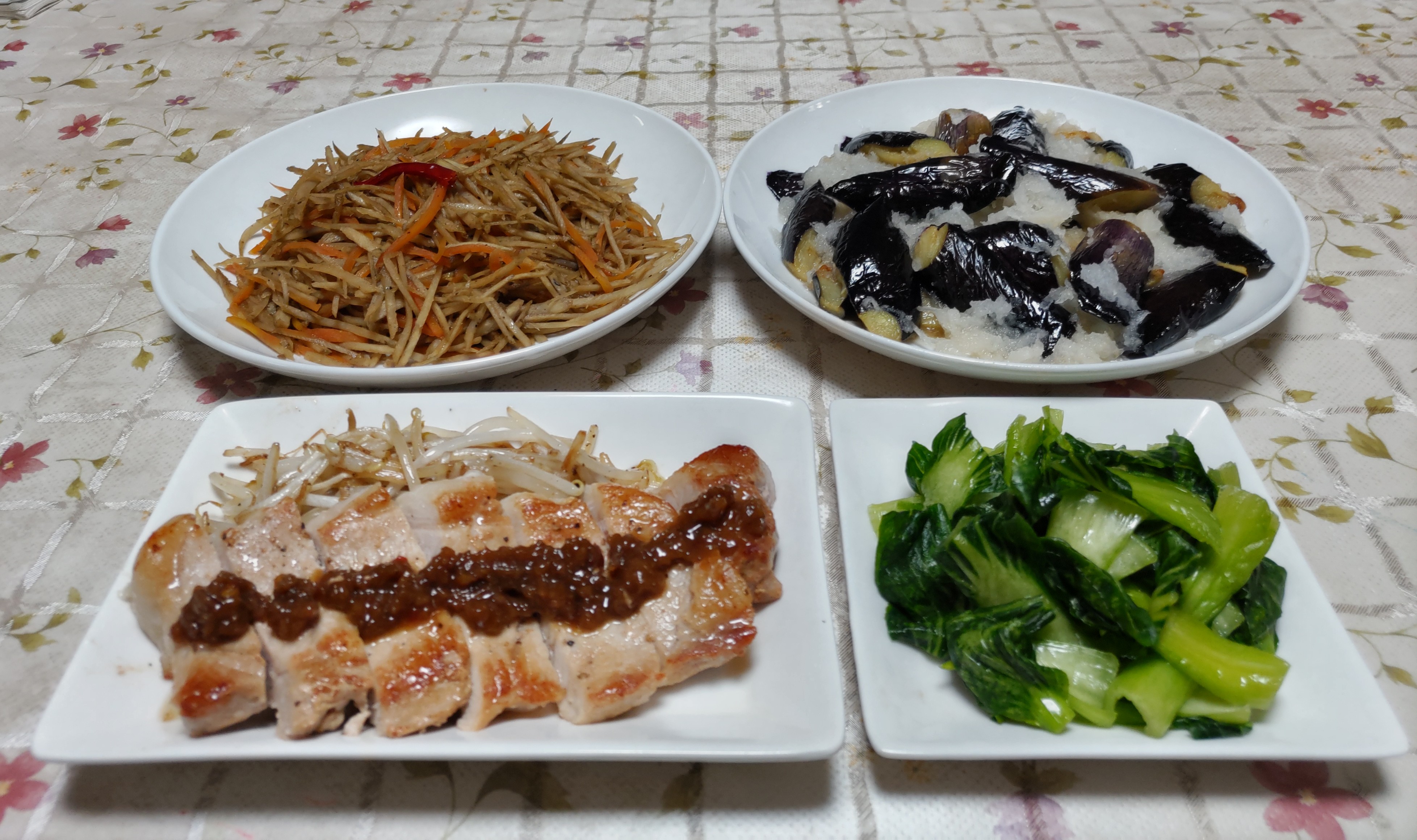 今日のごはん今日のごはんは豚スペアリブ大根とゼンマイの煮物ニンニクの芽入り野菜炒め漬物豚スペアリブは 豚スペアリブの表面に焼き色を付けて一度茹でこぼしてから砂糖・醤油・酒・ミリン・ニンニク・長ネギ・生姜を入れて圧力鍋で煮ました。大根とゼンマイの煮物は 大根・ゼンマイ・人参・油揚げを一緒に煮ました。ニンニクの芽入り野菜炒めは ニンニクの芽・キャベツ・人参を一緒に炒めて塩コショウで味付けました。漬物は 自家製のナスと生姜の味噌漬けです。ビニールトンネルの中でナスが順調に育っています。千両二号と言う長卵形のナスです。紫色のナスの花もきれいです。じゃが芋の花にも似ていますね。これは何年か前にもらって育てている「やぐらネギ」普通の長ネギはネギ坊主に種ができますが「やぐらネギ」はネギ坊主ができる部分から種ではなく直接小ネギができます。その小ネギを外して植え付けると根付いて育つので種まきしなくてもネギを育てる事ができます。地ネギ・一本ネギ・分葱・ネギ坊主ができにくい長ネギなど やぐらネギも含めて現在は何種類かのネギを育てています。ネギを食べるのも健康な秘訣だと思います。特に冬には風邪予防に大活躍します。