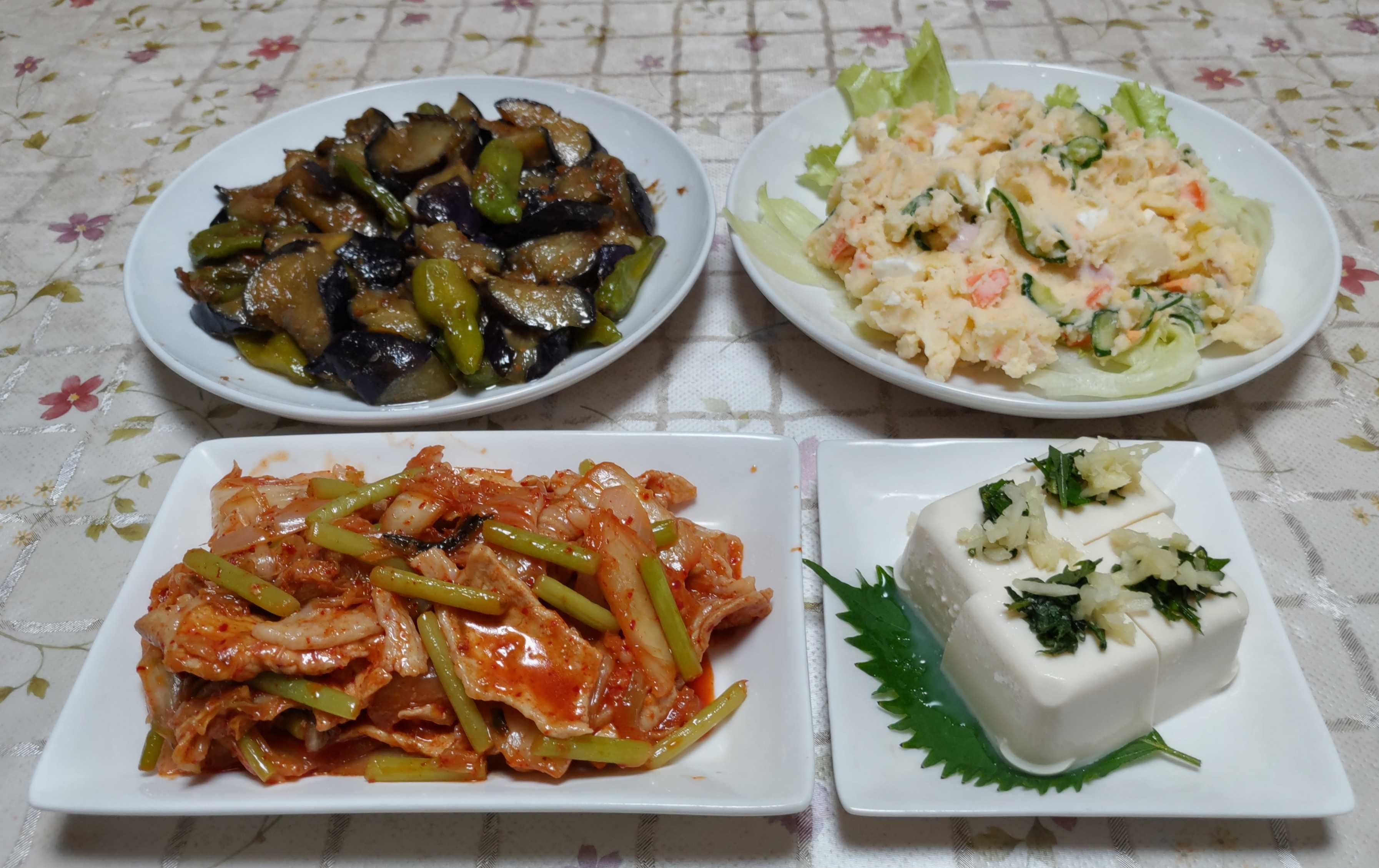 今日のごはん今日のごはんは豚キムチナスとシシトウの味噌炒めポテトサラダ冷や奴豚キムチは 生姜の千切りと玉ねぎと豚肉を炒めてキムチと冷凍しておいた自家製ニンニクの芽を加えて醤油少々で味付けしました。ナスとシシトウの味噌炒めは ナスとシシトウを炒めて味噌と砂糖で味付けました。ポテトサラダは 茹でたジャガイモ・人参・キュウリ・茹で卵・ハム入りの普通のポテサラです。冷や奴は 絹ごし豆腐に大葉と生姜を乗せて醤油少々かけて食べました。毎年庭のあちらこちらに勝手に生えてきて花を咲かせているタカサゴユリ今年もきれいに咲いてくれました。1本の茎から10個の蕾が付きました。現在5輪咲いて5個の蕾が開花を控えています。支柱で支えてあげないと頭が重くて倒れそうです。秋冬野菜の苗作りが始まりました。こちらはブロッコリーセルトレイに種蒔きをしてビニールポットに植え替えました。猛暑と害虫の被害で数が少なくなっています。こちらはキャベツです。これもセルトレイに種蒔きをしてからビニールポットに植え替えました。ブロッコリーと同じく猛暑の影響と害虫の被害でだいぶ数が少なくなりました。第二弾のキュウリ猛暑の中で頑張って育ってくれています。第一弾のキュウリが終わってから時々買って食べているので収穫が楽しみです。