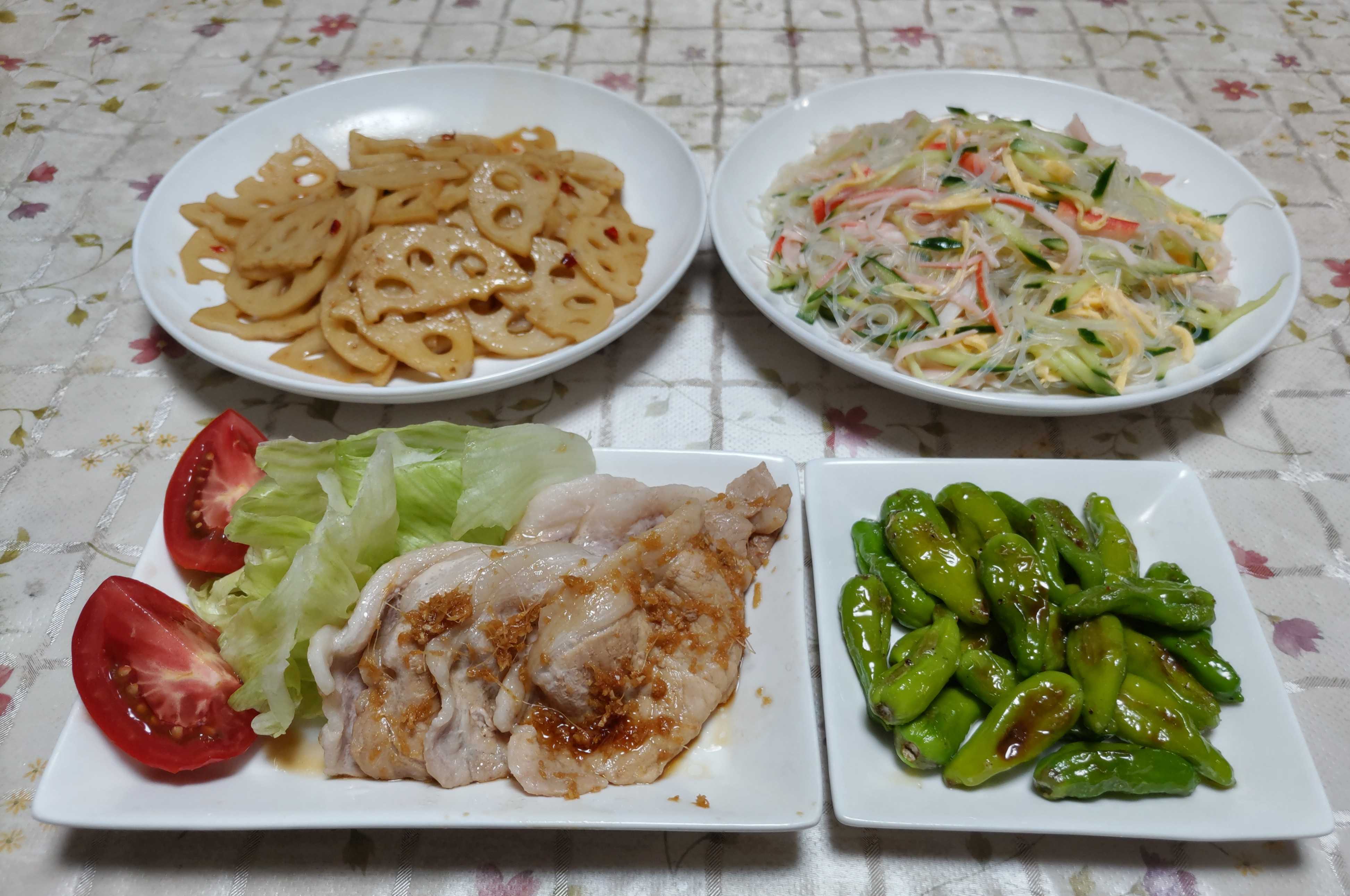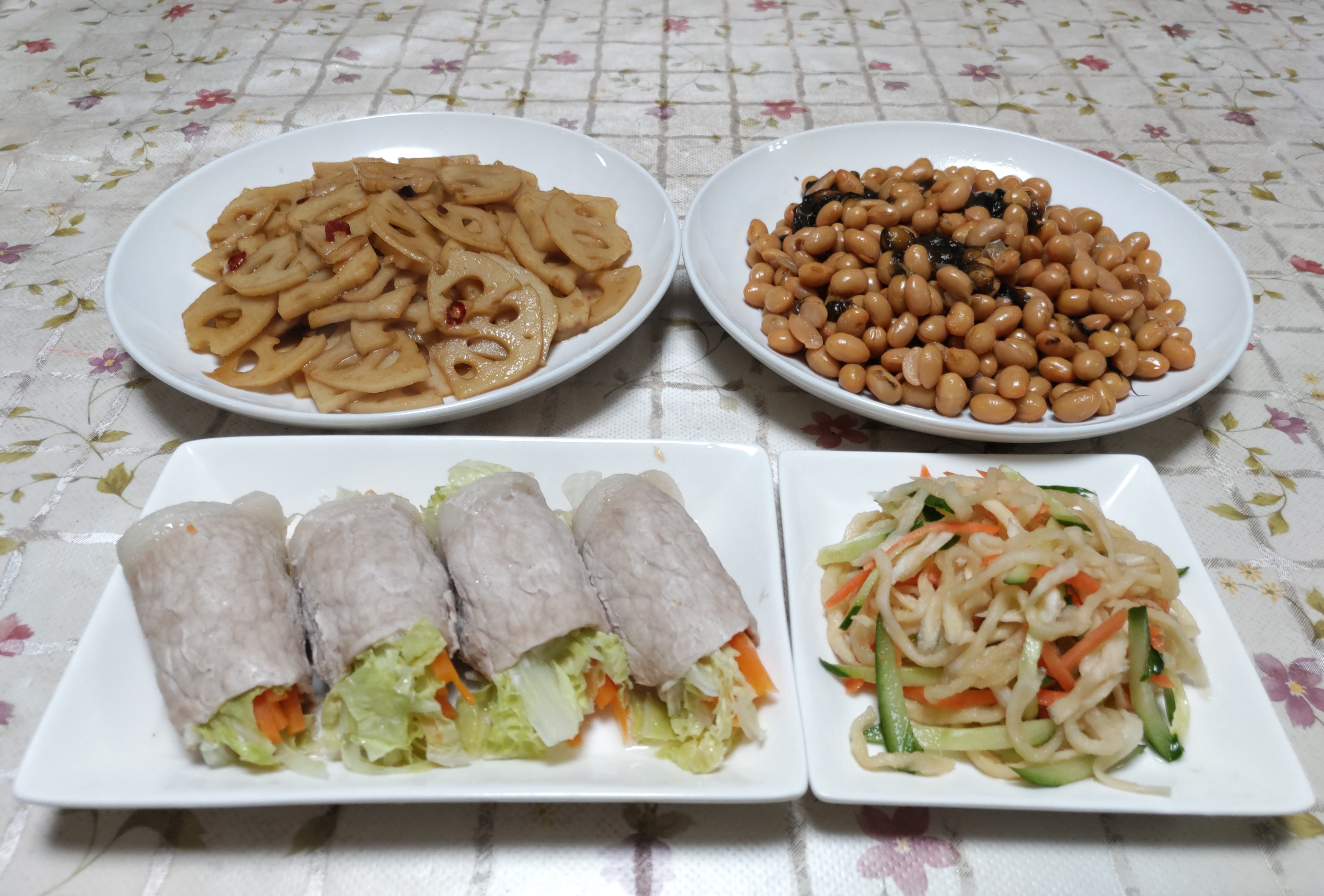 今日のごはん今日のごはんは白菜の肉巻きレンジ蒸し切り干し大根の酢の物蓮根のキンピラ大豆の煮物白菜の肉巻きレンジ蒸しは 白菜と人参の細切りを豚ロース肉で巻いて電子レンジで蒸しました。ゴマダレとポン酢醤油のそれぞれ両方食べました。切り干し大根の酢の物は ぬるま湯で戻した切り干し大根と人参とキュウリを酢の物にしました。レンコンのキンピラは レンコンの皮をむいてスライスして唐辛子を入れてゴマ油で炒めてキンピラにしました。大豆の煮物は 圧力鍋で水煮にした大豆に昆布を入れて煮ました。年末に知人から大豆・小豆・ササギ・ゴマなどをたくさんいただきました。手間ひまかけて作られた豆類とゴマは買うととても高いです。美味しくいただこうと思います。自家製のサツマイモ「紅はるか」を蒸し器で柔らかめに蒸して熱いうちに皮を剥いて7mm〜8mm位の厚さにスライスして天日干しにしました。空気が乾燥して良い天気が続いていたので2日半程で良い具合に干し上がりました。まるでハチミツで漬けたかのようにとても甘くて美味しいです。このまま食べても美味しいですがオーブントースターで少し炙って食べると更に美味しいです。孫たちも大好きなので良いおやつになります。いつでも食べられるように冷凍保存しました。
