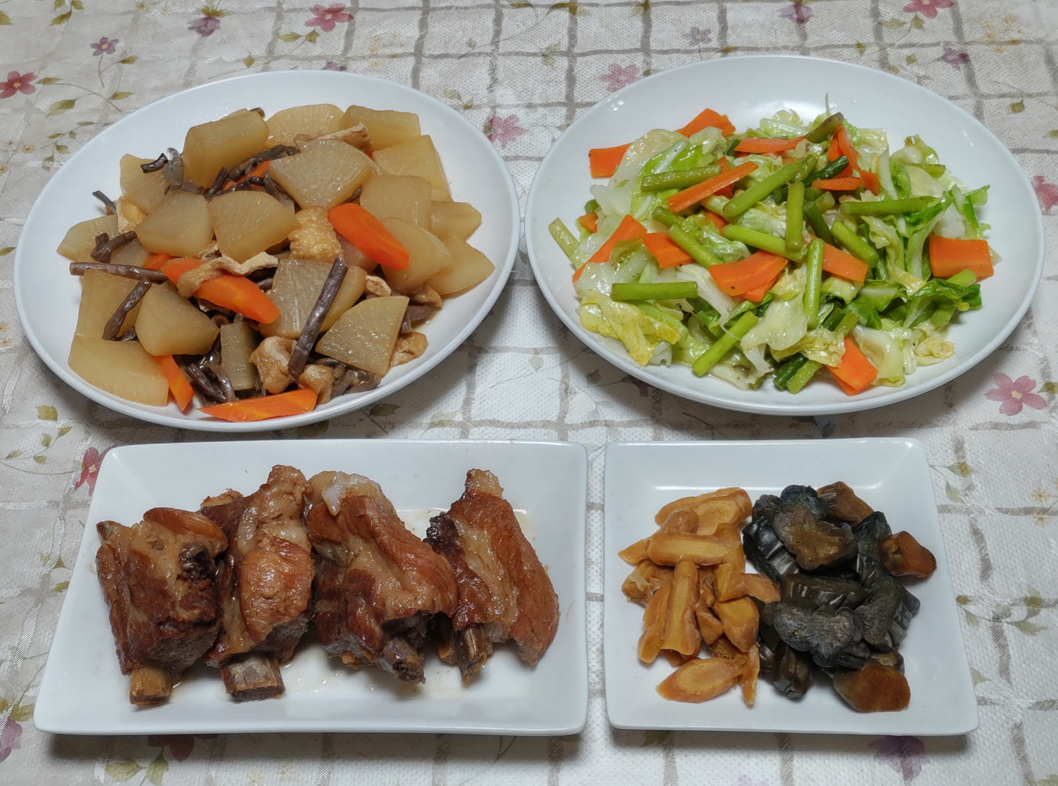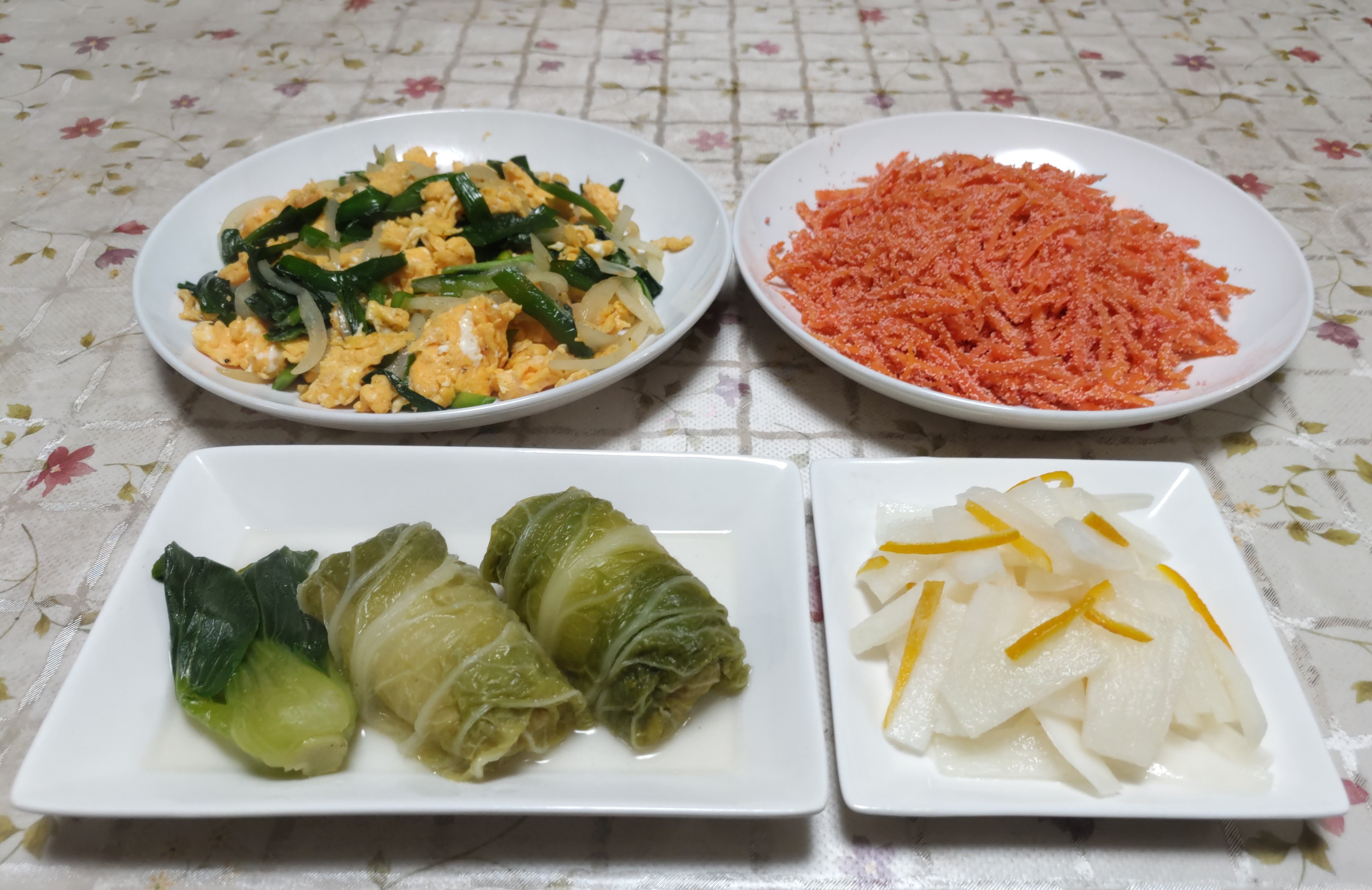 今日のごはん今日のごはんはロール白菜ニラ玉人参のタラコ炒め柚子大根ロール白菜は キャベツの代わりに自家製の白菜を使って作りました。味つけはコンソメと塩・砂糖です。小さめの青梗菜もサッと茹でて一緒に煮て盛り合わせました。ニラ玉は ニラと玉ねぎを炒めて塩コショウで味付けてから溶き玉子を流し入れて炒めました。人参のタラコ炒めは 細切り人参を炒めてからほぐしたタラコを合わせて炒め黒コショウで味を調えました。柚子大根は 拍子木切りした大根を酢・砂糖・塩・柚子果汁と細切りにした柚子の皮を加えて漬け込みました。塩けんぴを作ってみました。細長く切ったサツマイモを水に浸けてあく抜きしてから水気を切り米油で素揚げしました。カリっと揚がったサツマイモに 砂糖と塩と水をトロミがつくまで煮詰めたタレを絡めました。これも少しずつ小分けして冷凍保存しました。これも孫たちや私たちの良いおやつになります。ブロ友さんの所で美味しそうな皿うどんやちゃんぽん麺を見せて頂いてからずっと食べたいと思っていました。皿うどんは見つからなかったのでちゃんぽん麺を買って来て作って食べました。具材は淵だけ赤い蒲鉾とモヤシを買っただけで後は家にあるもので作りました。蒲鉾とモヤシの他は豚肉・キャベツ・人参・カブ・青梗菜を入れました。立派な具材を揃えなくても美味しいちゃんぽん麺を食べる事ができました。次は皿うどんを見つけて食べたいと思います。一年に一度の健康診断(人間ドック)今年も二人で受けに行って来ました。60年以上使ってきた体 それなりの検査結果ですがこの年齢で定期薬を飲むこともなく健康でいられる事は幸せな事だと思っています。市の特定健康診査の「Cセット」に胃がん・大腸がん・乳がん・子宮がんを追加して受けています。もし異常が見つかっても早期発見で最悪の事態は免れると思います。検査の数日前から食事の量を少し控えてちょっとだけ体重を減らしています。検査結果は2~3週間後 いつも通りの結果が出ると良いと思います。検査が全部終わり会計後お食事券が頂けるのでランチをしてから帰りました。朝食抜きの検査なのでとても美味しくいただきました。普通の生活ができて何でも美味しく食べられる身体で居られるように頑張ろうと思います。
