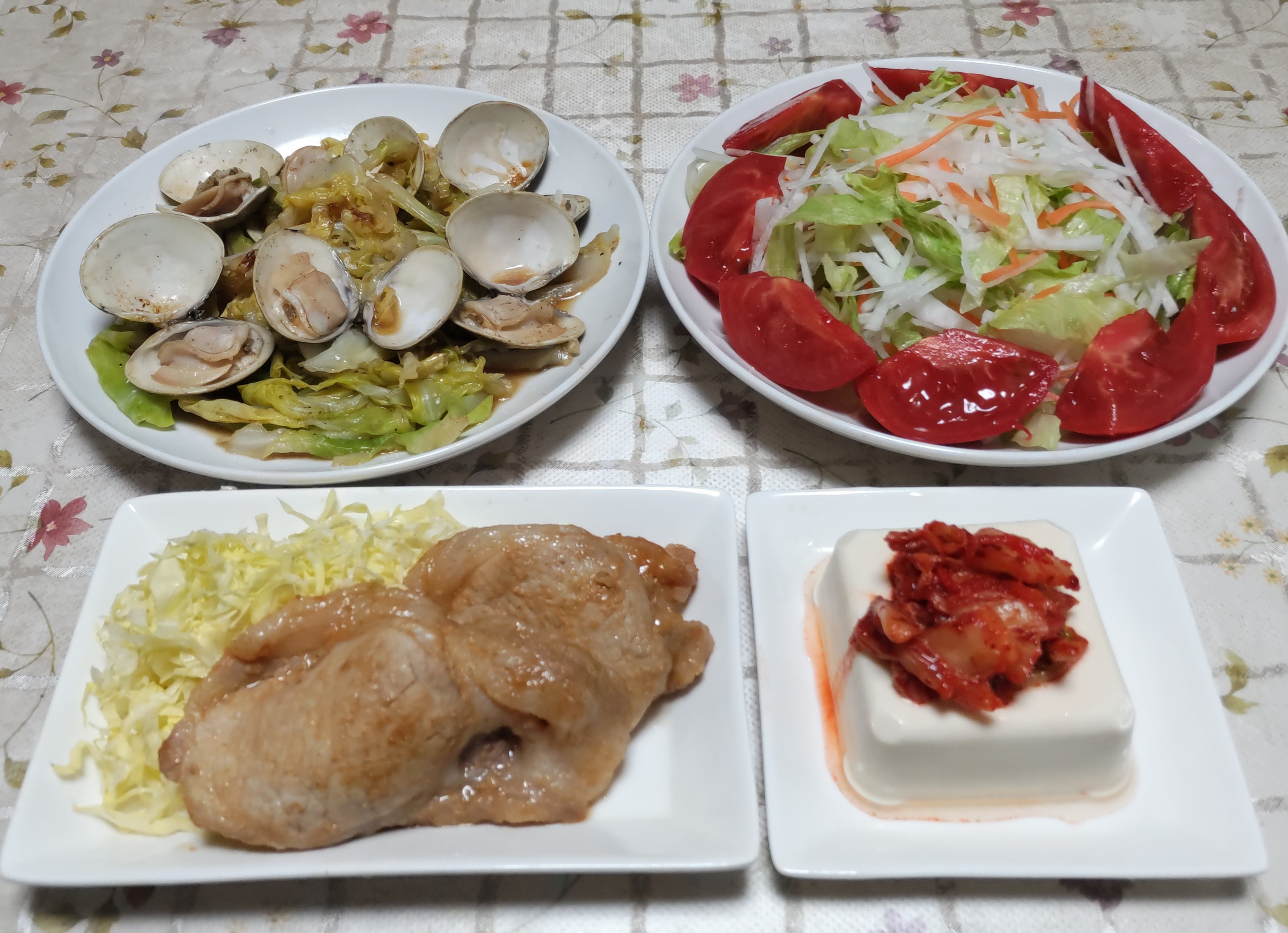 今日のごはん今日のごはんは豚ロース肉の味噌漬け冷や奴キャベツとハマグリの蒸し焼きサラダ豚ロース肉の味噌漬けは サイボクの豚ロース肉の味噌漬けを焼いて千切りキャベツと一緒に盛り付けました。冷や奴は 冷たい豆腐にキムチを乗せて食べました。キャベツとハマグリの蒸し焼きは フライパンにハマグリを並べてその上にキャベツを乗せて蓋をして蒸し焼きにして胡椒と醤油で味付けました。サラダは 大根・レタス・人参・トマトです。息子家族が潮干狩りに行ってお土産にハマグリを持ってきてくれました。立派なハマグリです。しっかり砂出しをしてから食べました。そのハマグリの中からこんな物が出てきました。1つは1cmにも満たない小さなカニの赤ちゃんもう1つはオレンジ色をしているエビの赤ちゃんかしら?びっくりして孫にラインを送ったら家も入ってたと言ってました。ブロ友曲まめ子さんの所で初めて「干し筍」と言う物を知りました。さっそく頂き物の筍で作ってみました。5cm位の大きさで2~3mm幅にスライスして並べて干しました。最初の日は曇り空でしたが風があったので夕方にはいい感じに水分が抜けてきました。翌日は青空の良い天気ですっかりカラカラに干しあがりました。まるでミイラになった昆虫のようにも見えます。白く見えるのはカビではなく筍に含まれるアミノ酸の「チロシン」が固まったものです。桃太郎トマト 花が咲き可愛い赤ちゃんトマトが付いています。こんな可愛いトマトを見ると嬉しくなります。色々な夏野菜で畑が賑やかになってきました。