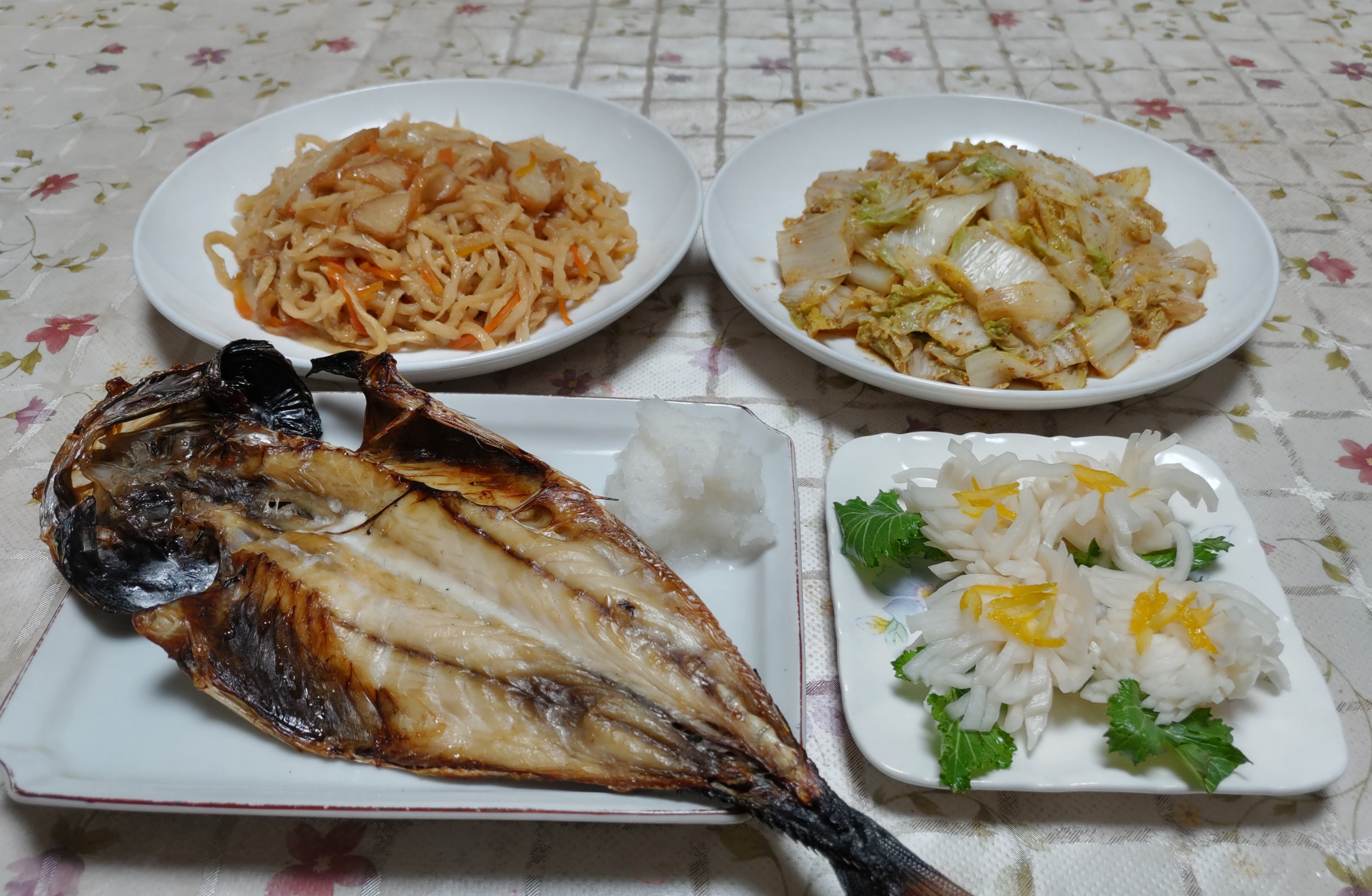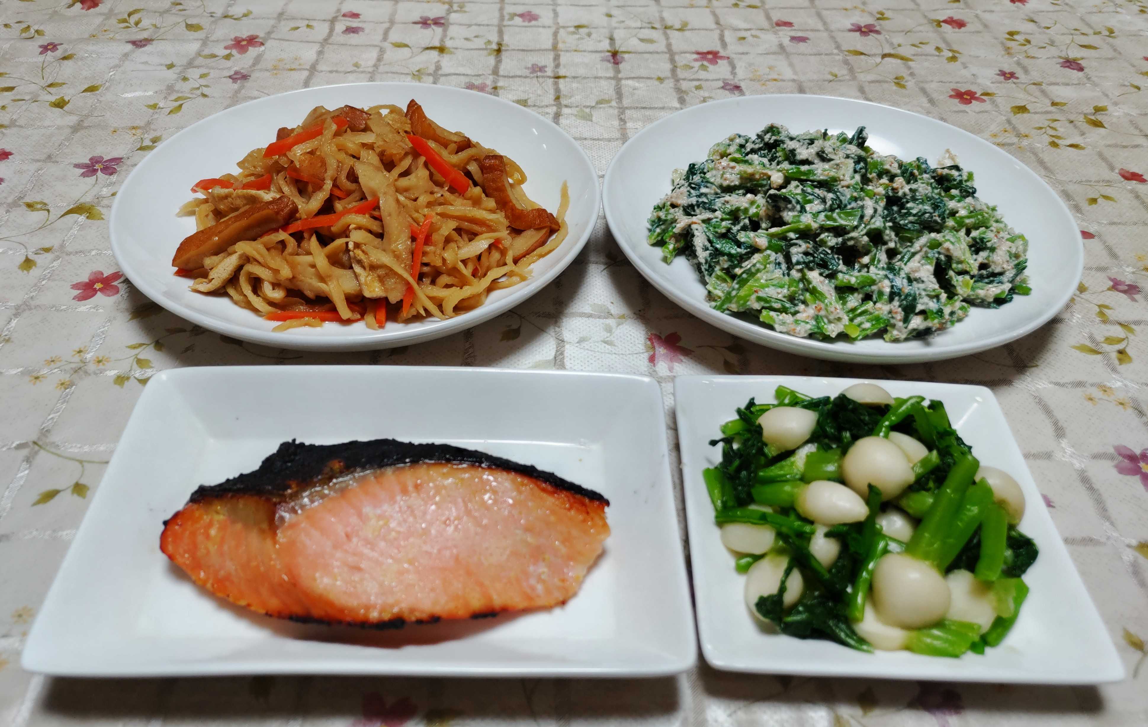今日のごはん今日のごはんは鮭の西京漬け切り干し大根の煮物小松菜の白和え間引きカブの漬け物鮭の西京漬けは 鮭の西京漬けをグリルで焼きました。焦げやすいのでアルミホイルをかぶせて焼きましたが焦げました。切り干し大根の煮物は 冷蔵庫内で保存していた自家製切り干し大根を煮ました。人参、竹輪、さつま揚げ、油揚げを入れて煮ました。小松菜の白和えは 茹でた小松菜を白和えにしました。間引きカブの漬け物は サッと湯通しした間引きカブを葉も茎も刻んで塩でもんで漬けました。ホウレン草が順調に育ってそろそろ収穫できそうは大きさになりました。小松菜はもう収穫して食べています。大根はもう少しで収穫できそうな太さになっています。サニーレタスも良い感じに成長して大きな株から収穫して食べています。庭のミカンも色づいて来ました。