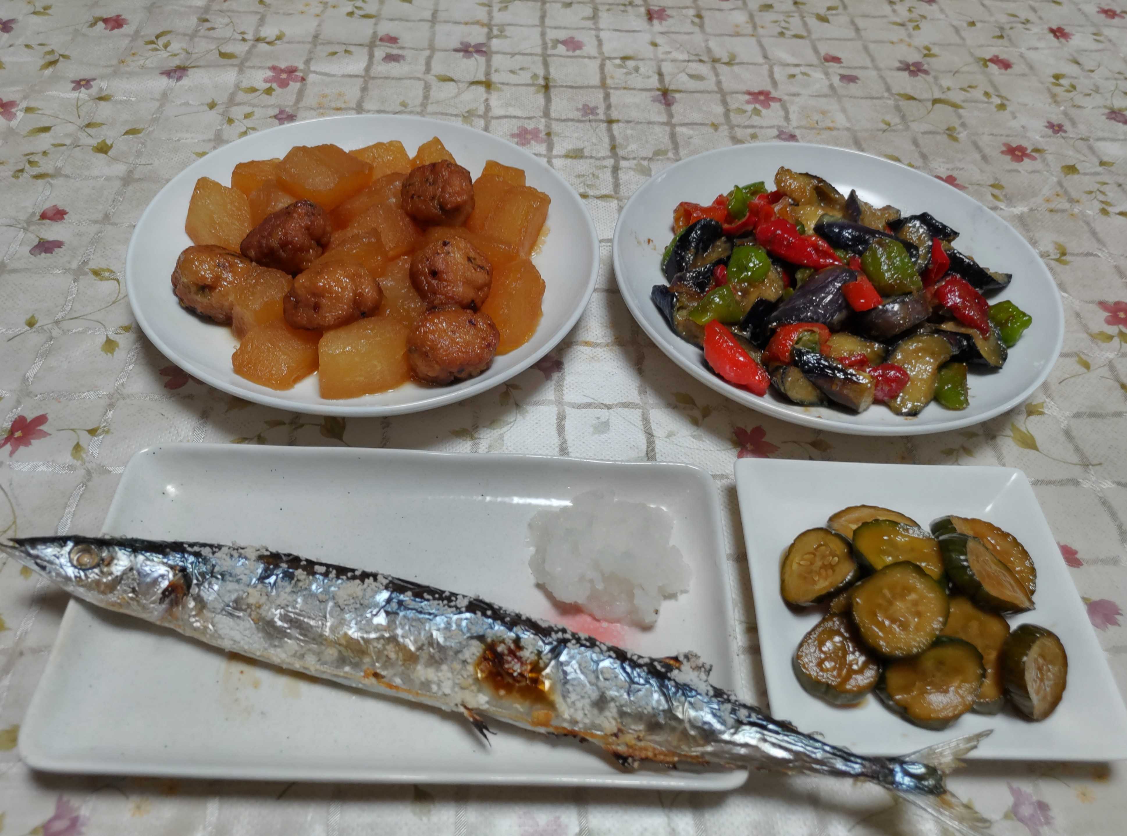 今日のごはん今日のごはんはサンマの塩焼きQちゃん漬け風漬物冬瓜と肉団子の煮物ナスとピーマンの味噌炒めサンマの塩焼きは 生秋刀魚に塩を振ってグリルで焼きました。大根おろしを添えて食べました。Qちゃん漬け風漬物は 第二弾のキュウリが採れるようになったのでまた作りました。冬瓜と肉団子の煮物は 豚ひき肉で作り揚げた肉団子と冬瓜を一緒に煮ました。ナスとピーマンの味噌炒めは ナスとピーマンと赤く色づいたピーマンを炒めて味噌と砂糖で味付けました。今年のサンマはいつもより大きくて立派で値段も手頃で脂が乗っていて美味しいです。今回で2回目今年はあと何回か食べられそうです。庭の萩の花が咲き始めました。裏庭に行く通路に伸びて邪魔になり切られても切られても伸びて元気に育っています。8月に100歳になった母ですが国から賞状と記念品を頂きました。額に入れられた大きくて立派な賞状と記念品は木箱に収められた銀杯です。本人は行けないので代わりに頂きに行って来ました。内閣総理大臣石破茂さんの名前が書かれています。近いうちに母がお世話になっている施設の個室に飾ろうと思います。母のお祝いの品を頂きに行ったついでに足を延ばして 嵐山町にある古民家そば屋さん「遠山」へ行って来ました。自然豊かな場所にあり景色もきれいです。手打そばと天ぷら天ぷらが大きくて立派なんです。海老2尾とカボチャとサツマイモ 下にあり見えませんが人参も。切り干し大根とキンピラゴボウと漬物が少しずつ付いてデザートは栗でした。平日なので私たち夫婦と同じようなシニアの夫婦やお友達同士で賑わっていました。娘夫婦の小6の孫2号が修学旅行へ行ってお土産を買ってきてくれました。撮影する前に皆で食べたので残り3枚になりましたが10枚入りでした。家族5人にそれぞれお土産を買ってお菓子は私たちの分だけだと言うのですぐに開けて皆で1枚ずつ美味しく頂きました。行き先は日光3月に3家族で訪れた日光江戸村へも行ったそうです。修学旅行はどうだった?と聞くと「疲れた」とか「食事が冷たかった」とか「オニヤンマを見れて嬉しかった」とか。昆虫大好きな孫2号はオニヤンマを見た事が一番の思い出だったようです。他にも色々思い出ができた事と思いますけどね。その日の夕食は息子家族も誘って3家族12人でファミレスへ行きそれぞれ好きなものを食べて楽しみました。