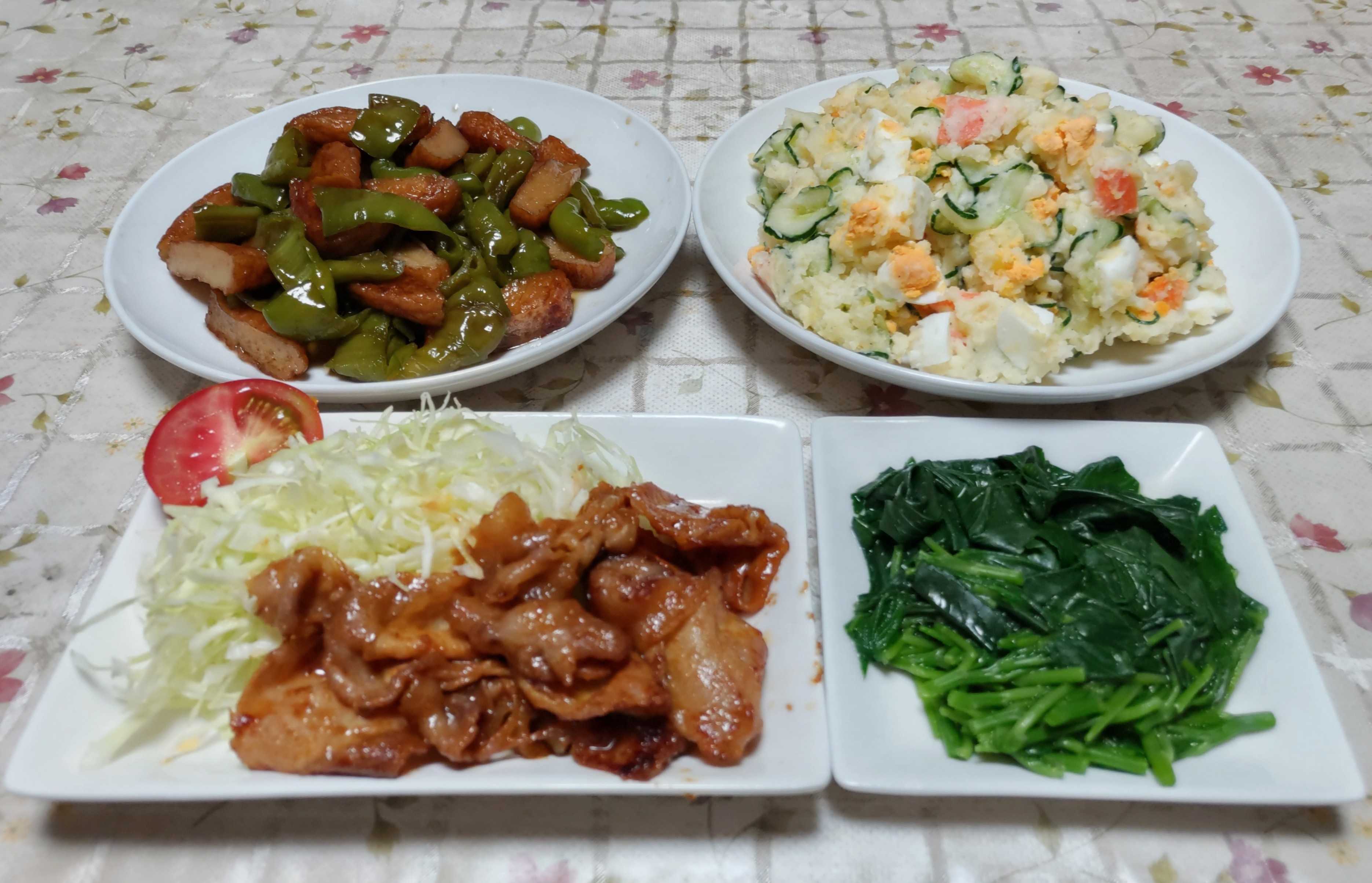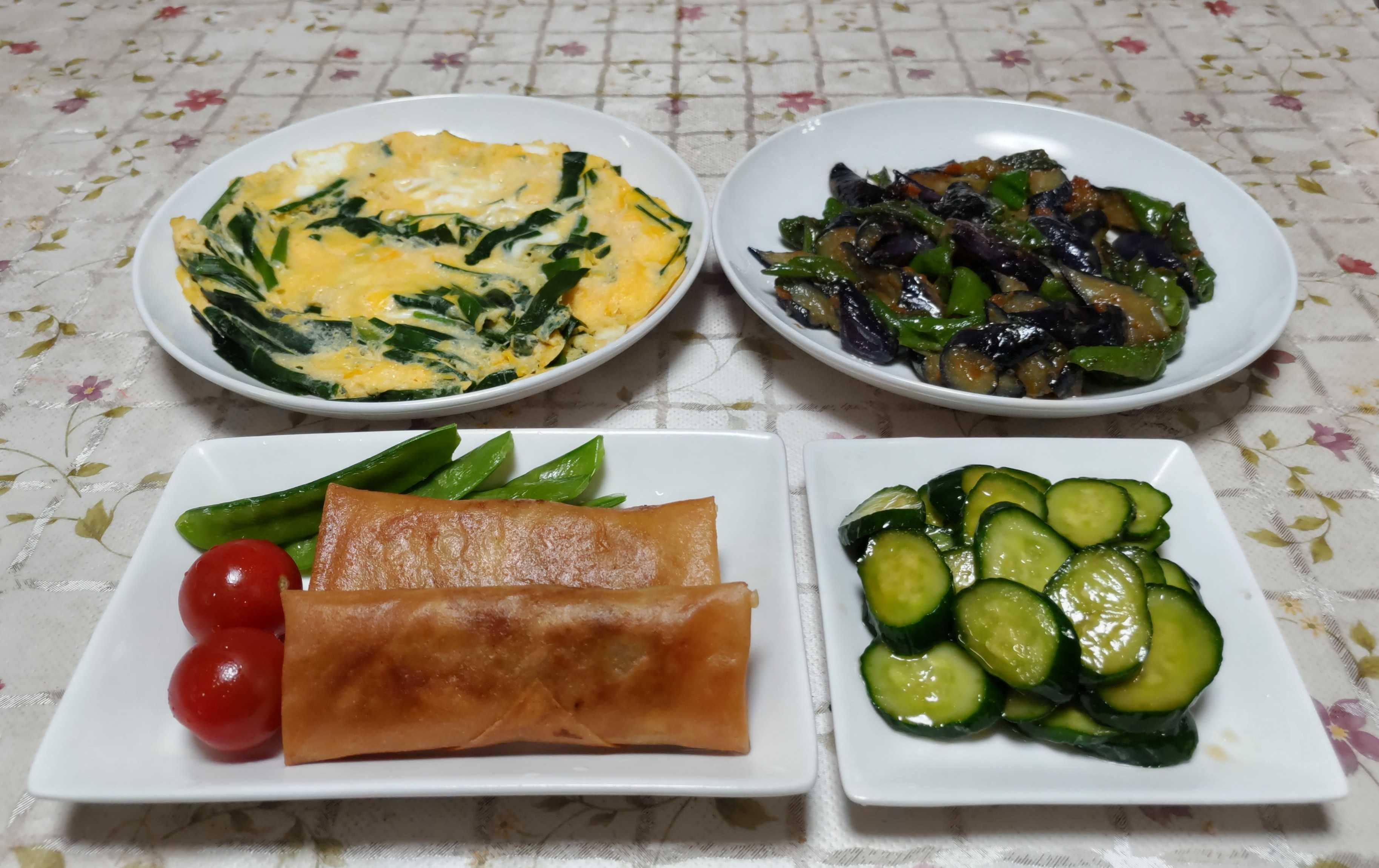 今日のごはん今日のごはんは春巻きニラの卵とじナスとピーマンの味噌炒め漬け物春巻きは 筍をたくさんもらった時に多めに作って冷凍保存しておいた春巻きを揚げました。ニラの卵とじは ニラが元気に育ってきたのでニラ玉を作りました。ナスとピーマンの味噌炒めは 初収穫のナスとピーマンをサラダ油で炒めて砂糖と味噌で味付けました。漬け物は キュウリに軽く塩を振りしんなりさせてから麺つゆ・ごま油・ニンニクと合わせて漬け込みました。ネットで見つけた漬物を作ってみました。初生りのナスとピーマン 少し小さめですが収穫しました。小さな苗が届いたお彼岸頃に気温が低くなり寒さの被害を受けたナスですが元気に育ってくれました。ナスも採れるようになりました。まだ小さい株のピーマンですが立派なピーマンが生っています。大玉トマトの桃太郎少しだけ赤く色付いてきました。ミニトマトがぎっしり生っています。息子の家の入り口横に植えてあるヤマボウシ最初は薄い黄緑色で大きくなるに連れて白くなってきます。今年もたくさんの花を咲かせています。花が終わった後の赤い実も可愛いです。気温が高くなり雨が多いので畑の野菜たちが元気に成長しています。それに負けずに雑草たちが更に元気に成長しています。今年もまた雑草たちとの闘いが始まりました。体調に気を付けながら 雑草たちに負けない様に頑張ろうと思います。
