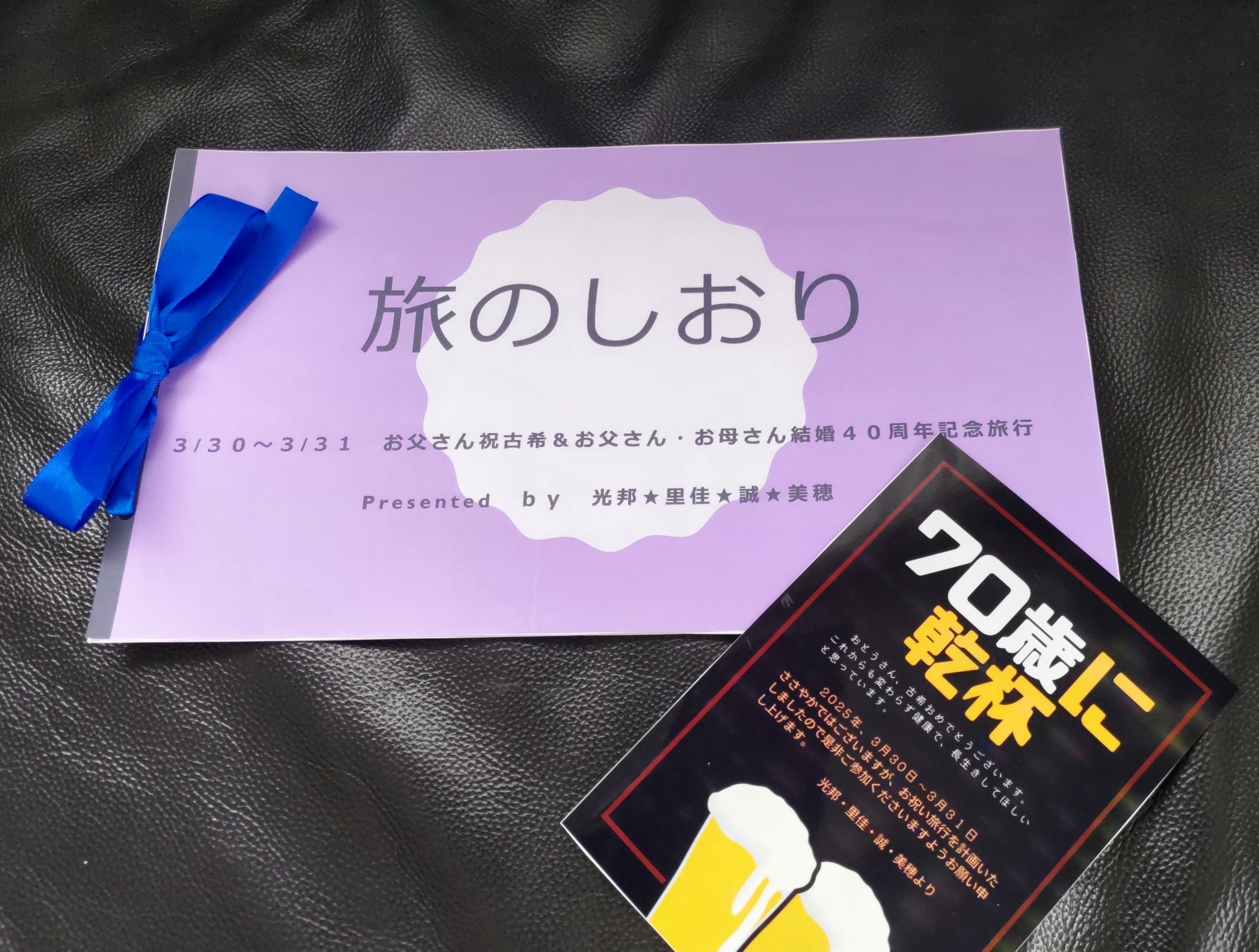 夫の古希祝い&結婚40周年記念旅行娘夫婦と息子夫婦が夫にサプライズで「古希祝い&結婚40周年記念旅行」を計画してくれて3月30日〜31日で旅行に連れて行ってくれました。夫にはその2日間は予定を入れないように伝えただけで旅行の二日前に招待状として旅行の栞を届けてくれました。最初は川治温泉街にある日光トレジャーハンティングで謎解きをしながら宝探しをしました。金属探知機を使って謎解きをします。謎解きが終わったら出た答えの番号で箱を開けて箱の中から本当の宝箱のカギを探し出して宝物を頂くゲームです。ところが箱の中から小さなカギを探し出すのに苦戦して結局宝物はゲットできませんでした。終わってから温泉街を散策してお肉屋さんでコロッケやメンチなどそれぞれ好きなものを買って食べ歩きしました。足湯にも浸かりましたよ。次は「日光花いちもんめ」でイチゴ狩りを楽しみました。完熟イチゴの食べ放題みんな好きなだけ自分で採って食べました。ただ一人イチゴが苦手の息子だけイチゴ狩りは不参加で外で待っていました。食べなくてもイチゴ温室に入るにはお金がかかってしまいますから。お腹いっぱいイチゴを食べた後は球根ベゴニアや木立ベゴニアなどたくさんの花が咲いている植物園をゆっくりみてまわりました。多種多様な色鮮やかな花たちがとてもきれいでした。孫たちは小動物コーナーでモルモットやウサギやハムスターと触れ合ったり餌やりをしたりして楽しんでいました。この日の宿は鬼怒川温泉由緒正しき鬼怒川の名湯に何度もつかり穏やかなひとときを過ごしました。夕食は古希祝いのお食事が用意されていました。次々にお料理が運ばれてきてお腹がいっぱいになりました。こんな祝い着と大きなケーキを用意してもらって夫は驚きながらも大喜びで満面の笑顔になりました。夕食が終わり部屋に戻ったら孫たちが私達の部屋に集まって肩や背中や腰などを皆でマッサージしてくれました。気持ちが良くて嬉しくて体も心も癒されましたよ。古希祝いにもらったポロシャツを着て孫6人と記念写真を撮りました。左胸に古希祝いの70と書かれていて後ろには孫6人がそれぞれ描いたイラストがプリントされています。2日目は EDO WONDERLAND日光江戸村へ行きました。忍者、侍、姫、花魁など江戸の時代に戻ったような雰囲気を楽しみました。この日は時々雪が舞う寒い日でしたが閉園まで1日中遊びました。川越市に戻ってレストランで夕食を済ませて解散の予定でしたが孫1号が翌日は部活など何も予定ないからお泊りできるんだと言う事で男児5人お泊りしました。翌朝は3歳の孫6号も仲間入りしてまた賑やかな1日になりました。庭の牡丹の花が咲き始めました。大きな花で華やかです。骨折した左手首はまだ強張りはありますが整形で電気による治療をしながら自分でもネットを見ながらリハビリをして少しずつ良くなっています。料理もできない所は手伝ってもらいながら作っています。桜のお花見は今年は諦めていましたが息子のお嫁さんの声掛けで娘家族と息子家族と一緒に行くことができました。
