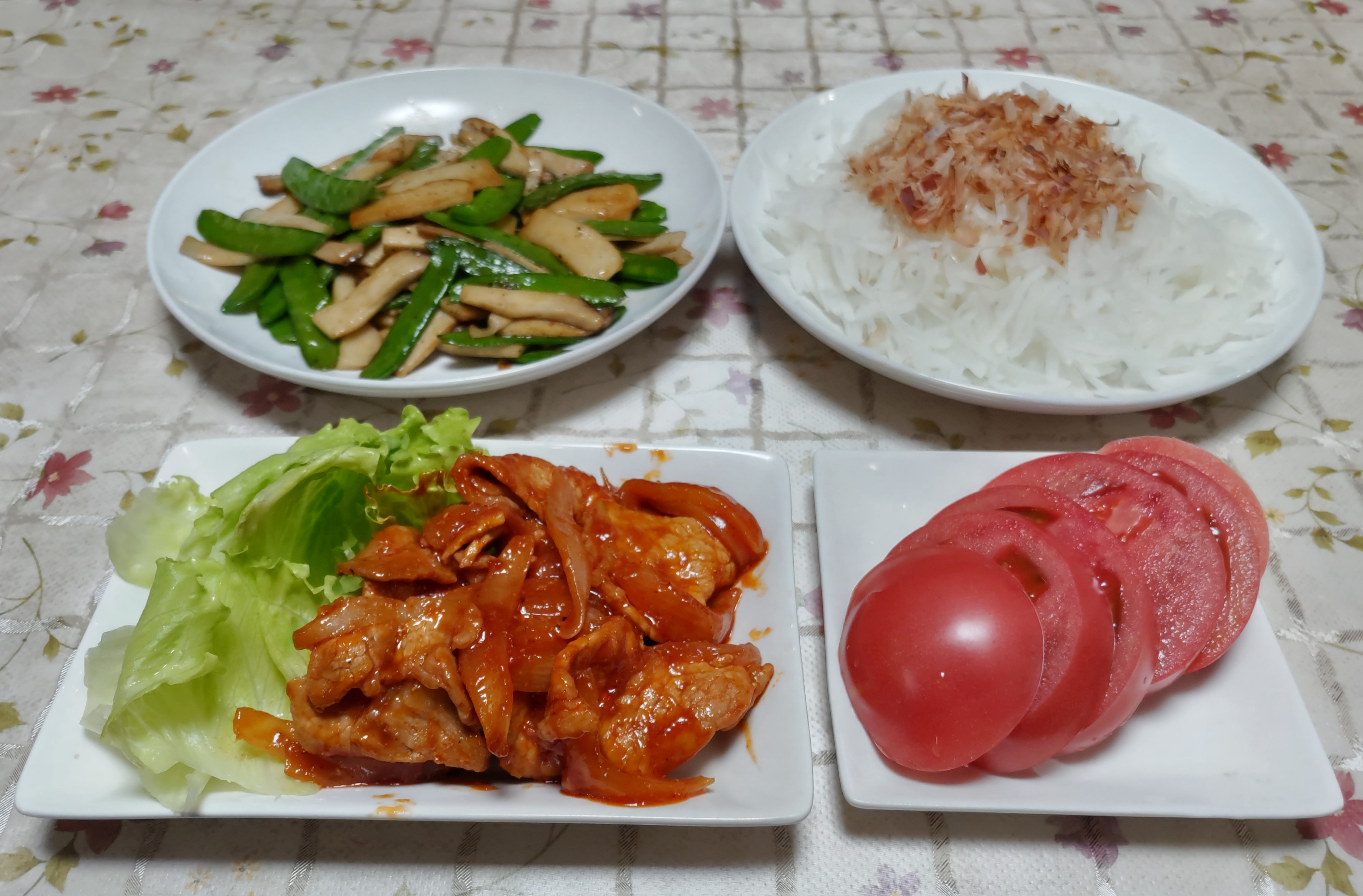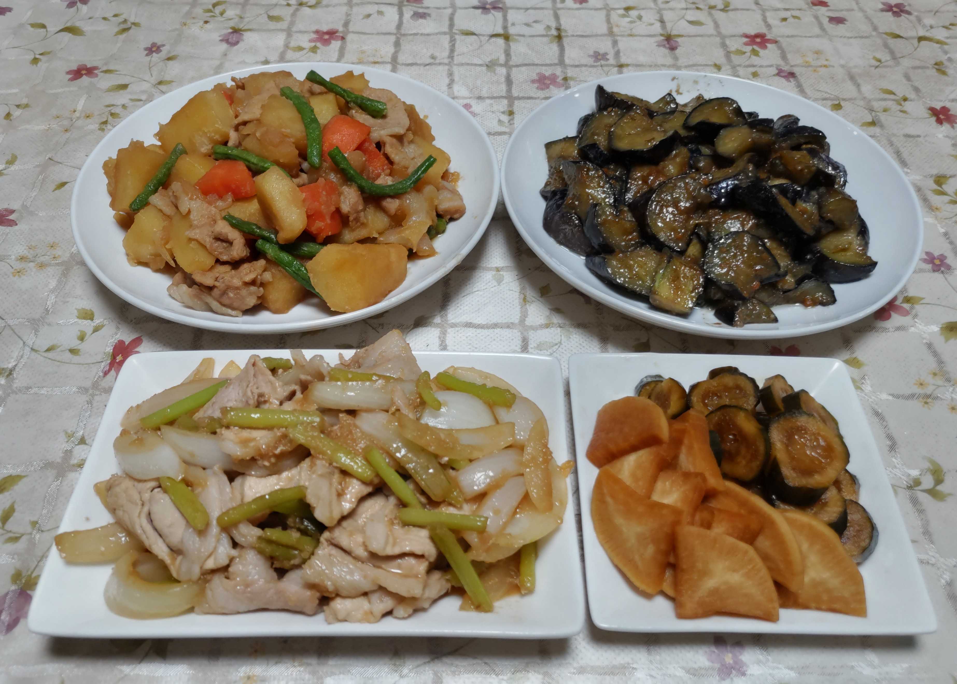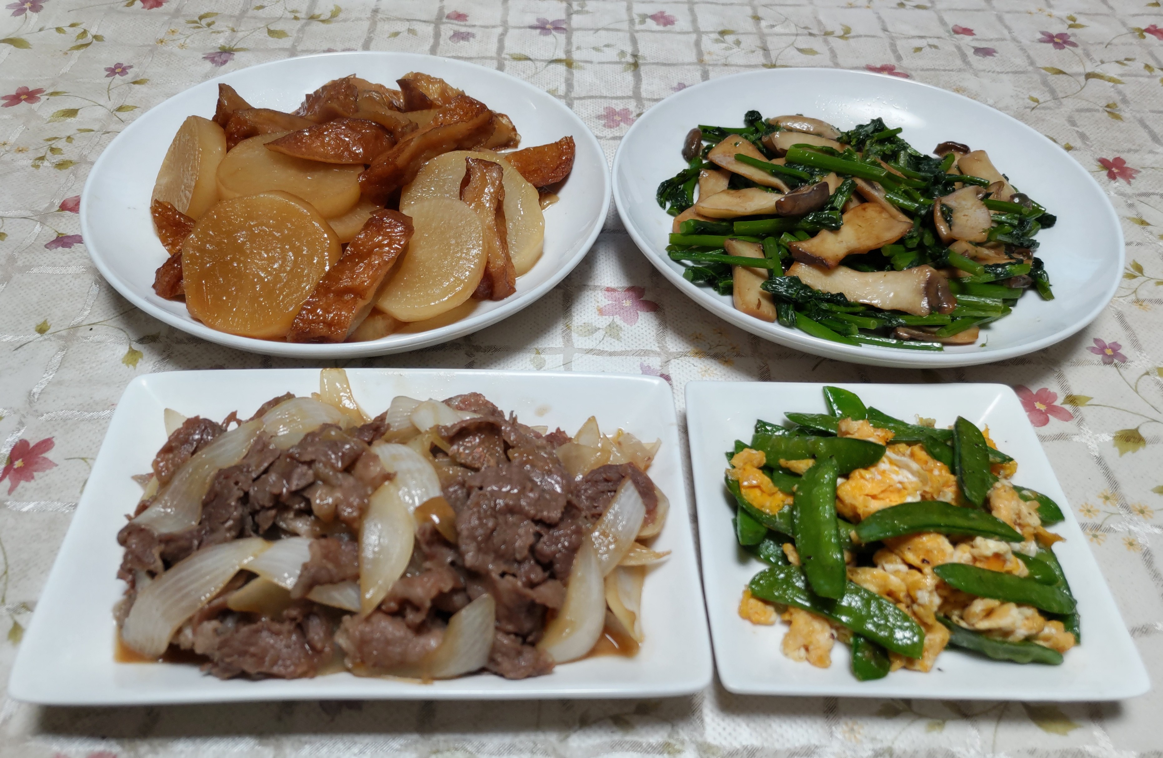 今日のごはん今日のごはんは牛肉と新玉ねぎの甘辛煮大根の煮物小松菜の菜花とエリンギの炒め物絹さやの玉子炒め牛肉と新玉ねぎの甘辛煮は 新玉ねぎを甘辛く味付けてから煮汁の中に牛肉を入れて煮ました。大根の煮物は 大根とさつま揚げを一緒に煮ました。小松菜の菜花とエリンギの炒め物は さっと茹でた小松菜の菜花とエリンギを炒めてニンニク醤油で味付けました。絹さやの玉子炒めは 絹さやを炒めて塩コショウをして溶き玉子を流し入れて炒めました。ごちゃごちゃした料理ばかりでメイン料理がハッキリしない夕食になりました。種まきが遅くて春になってから畑に植え付けた絹さやが株が小さいながらも花盛りで実をたくさん付けています。採れたての絹さやは甘みがあり風味が良くて美味しいです。新玉ねぎも大きめのから採って食べています。柔らかくて美味しいです。今年はジャガイモの種芋を植え付ける時期に骨折したので夫が一人で準備して植え付けました。1週間くらい前ですがジャガイモの芽欠きをして2本立てにしました。友人からもらった赤い皮のジャガイモ アンデスレッドを少しだけですが植えてみました。他のジャガイモと違って茎が赤いです。今年のジャガイモはいつものダンシャク・キタアカリ・メークインと今年初めてのアンデスレッドです。夏野菜は カボチャ・ナス・キュウリ・トマトなどの苗を畑に定植してビニールトンネルをかけました。近いうちに元気に育っているスイカの苗を植える予定です。長ネギの苗も植えて 他の夏野菜の種まきもする予定です。左手はまだ少し不自由ながら畑仕事をする事でリハビリになると思って頑張っています。