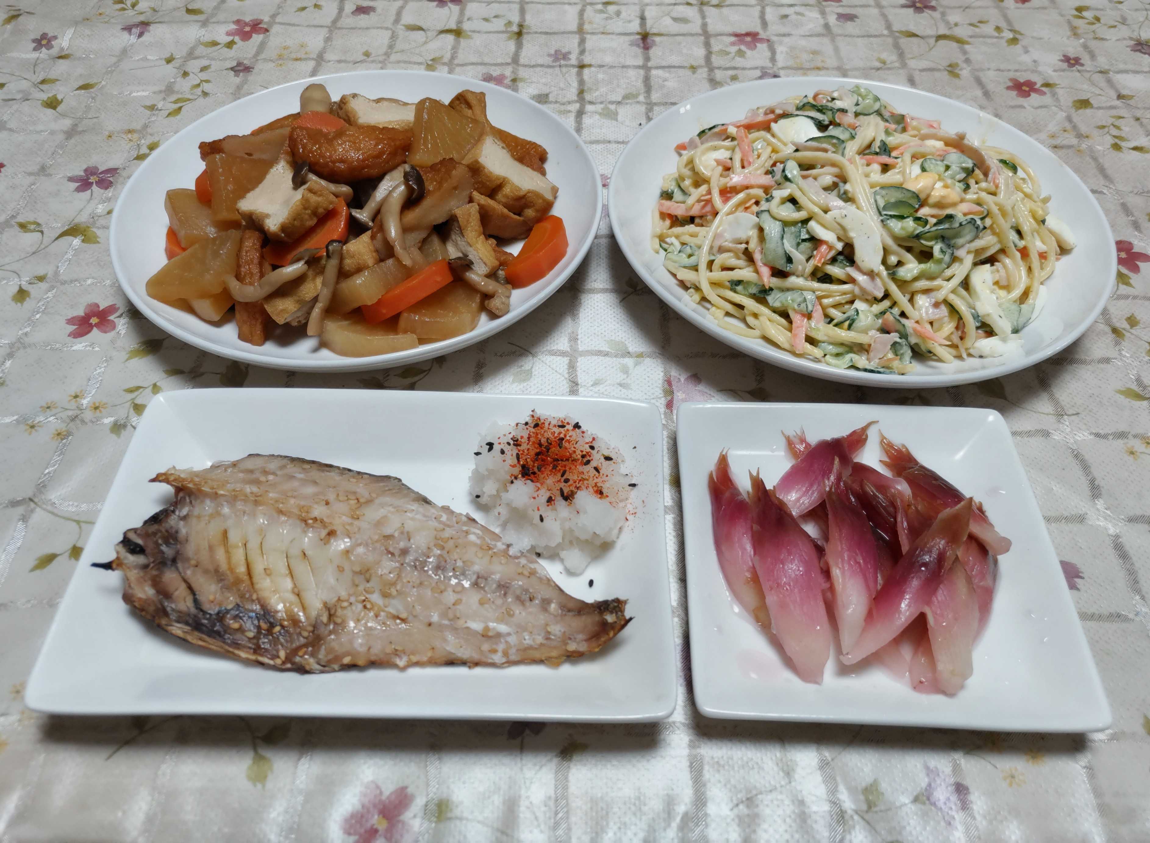 今日のごはん今日のごはんはとろアジ茗荷の甘酢漬け大根と厚揚げの煮物スパゲティサラダとろアジは とろアジの干物をグリルで焼きました。大根おろしに七味唐辛子を振って添えました。茗荷の甘酢漬けは 四つ切りにした茗荷を熱湯に通してから甘酢に漬けたものです。大根と厚揚げの煮物は 大根・厚揚げ・人参・さつま揚げ・シメジを一緒に煮ました。スパゲティサラダは 1/4の長さに切ったスパゲティを茹でて酢・砂糖・塩コショウで下味を付けてからキュウリ・人参・茹で卵・ハムと合わせてマヨネーズで和えました。急に気温が下がり秋らしくなってきました。過ごしやすくなり煮物が食べたくなりました。セルトレイに種蒔きした白菜が順調に育っています。同じくセルトレイに種蒔きしたサニーレタスも順調に育っています。畑には大根の種を蒔いて 小松菜の種も蒔いて 玉葱の種も蒔きました。セルトレイで育てていたキャベツ・ブロッコリーも畑に定植して秋冬野菜作りが進んでいます。庭に植えてある「早生の富有柿「も色づいたので収穫してみました。とても甘くて美味しいです。少し離れた場所にある畑に植えてある栗の木から栗を拾って来ました。「利平」と言う栗で粒が大きくて茹でて食べるとホクホクで美味しいです。皮をむいて栗ご飯も作って食べました。ゴロゴロと栗がたっぷり入った栗ご飯はとても美味しいです。今年初めて花を咲かせたパイナップルが元気に育ちパイナップルの形になってきました。毎日見るのが楽しみですが急に気温が下がり少し心配でもあります。門柱の隣に植えてあるノウゼンカズラの花が再び咲き始めて今花盛りできれいです。