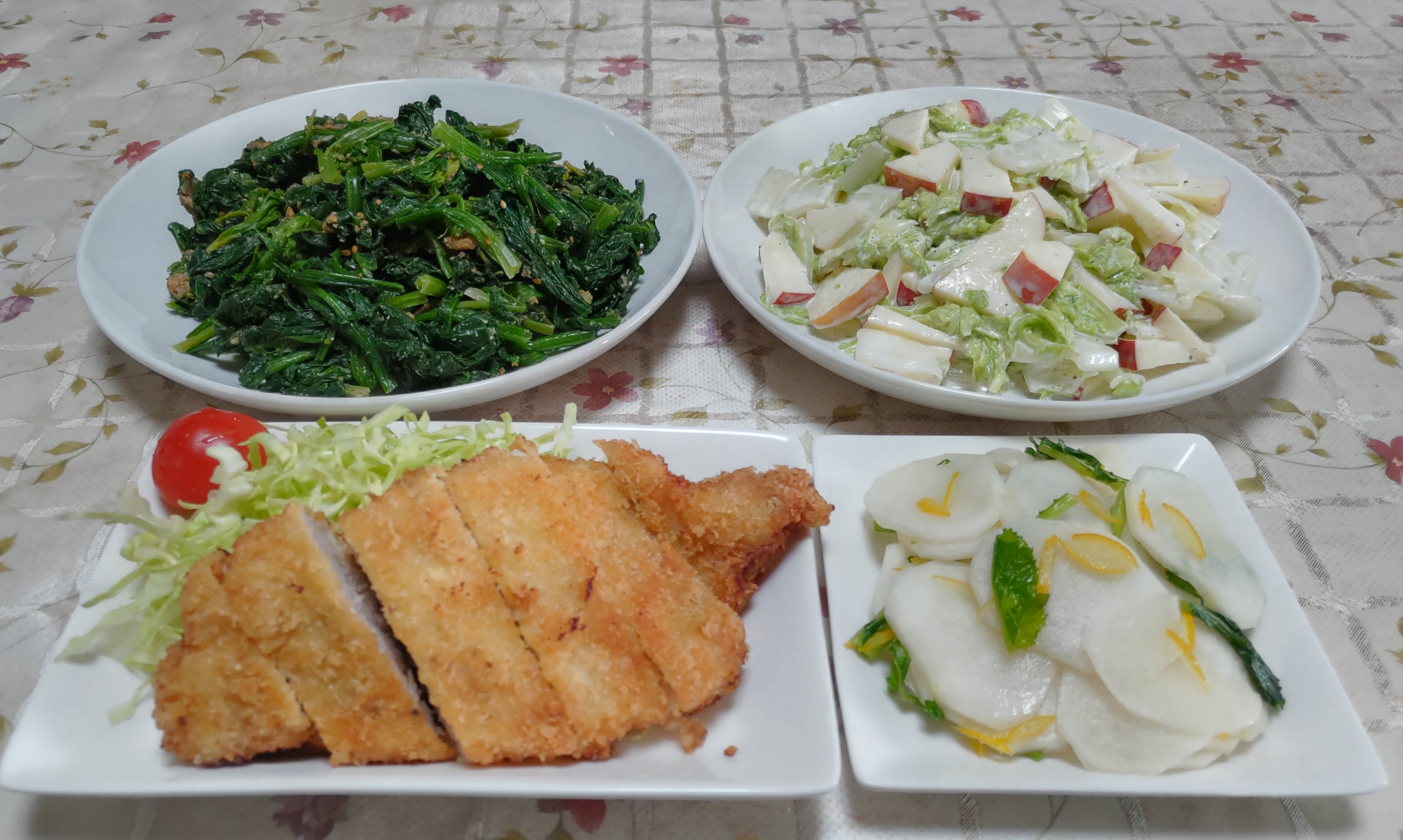 今日のごはん今日のごはんは豚カツホウレンソウの胡麻和えサラダ漬け物豚カツは豚カツ用の豚ロース肉に塩コショウをして小麦粉・溶き玉子・パン粉の順に付けて揚げました。千切りキャベツとミニトマトを添えました。ホウレンソウの胡麻和えは ホウレンソウを茹でてすりゴマ・砂糖・味噌で和えてゴマ和えにしました。サラダは 収穫したての白菜を切って軽く塩もみしてリンゴと一緒にマヨネーズ・酢・砂糖・塩コショウで和えてサラダにしました。漬け物は カブを茎を少し入れて柚子の皮と一緒に塩でもんで即席漬けにしました。今冬はお野菜の価格が高騰していますね。去年の長引く猛暑の影響で秋冬野菜の種まきが遅れてしまいました。大根・白菜・人参・カブ・青梗菜・ホウレンソウ・小松菜・かき菜・スティックブロッコリー・春菊などの種まきはできましたがキャベツやブロッコリーの苗作りまで手が回らず今年は作れませんでした。そんな時に限ってキャベツがかなり高額なお値段になっています。高いけれど久し振りに生野菜が食べたくてキャベツやレタスなどを買いました。せっかくキャベツがあるうちにと思い豚カツを作って食べることにしました。他の野菜たちも雨不足と寒さのために成長がゆっくりですが新鮮なお野菜を食べられる事に幸せを感じています。少し前にブロ友さんの所でホースから氷が次々と飛び出してくる動画が紹介されていました。私はコメントで「あるあるです」と書き込みました。鉢植えの花たちに水やりをしようと水道をひねるとホースからこんなに氷が出て来たので撮影してみました。ホースの中から氷が出終ってからお花たちに水やりをしました。12月初旬に寄せ植えした鉢植えです。植えた時は固い蕾だったギョリュウバイが咲いて華やかになりました。この葉牡丹は1ポットから4本出ています。ヒデンス・イベリスと一緒に寄せ植えにしました。この寄せ植えはガーデンシクラメンがたくさん咲いてきました。こちらの葉牡丹は真っ白なお花のようできれいです。マジックドラゴン・ビオラと一緒に寄せ植えにしました。玄関を出る時 入る時にきれいな花たちに癒されています。お花のある暮らしは良いですね。庭の蝋梅も蕾が開き始めました。ふっくら丸い蕾も可愛いです。前を通るたびに良い香りがします。