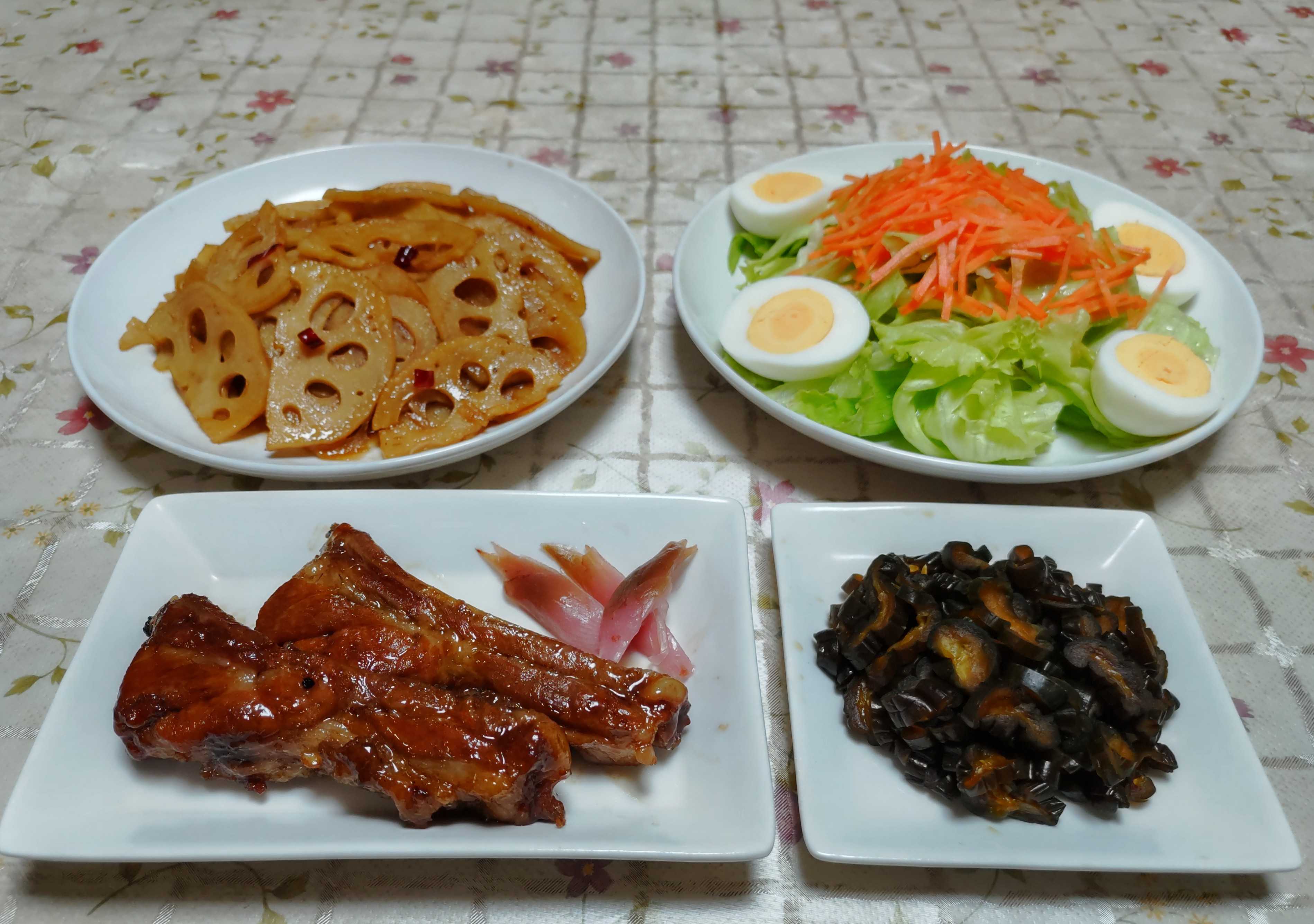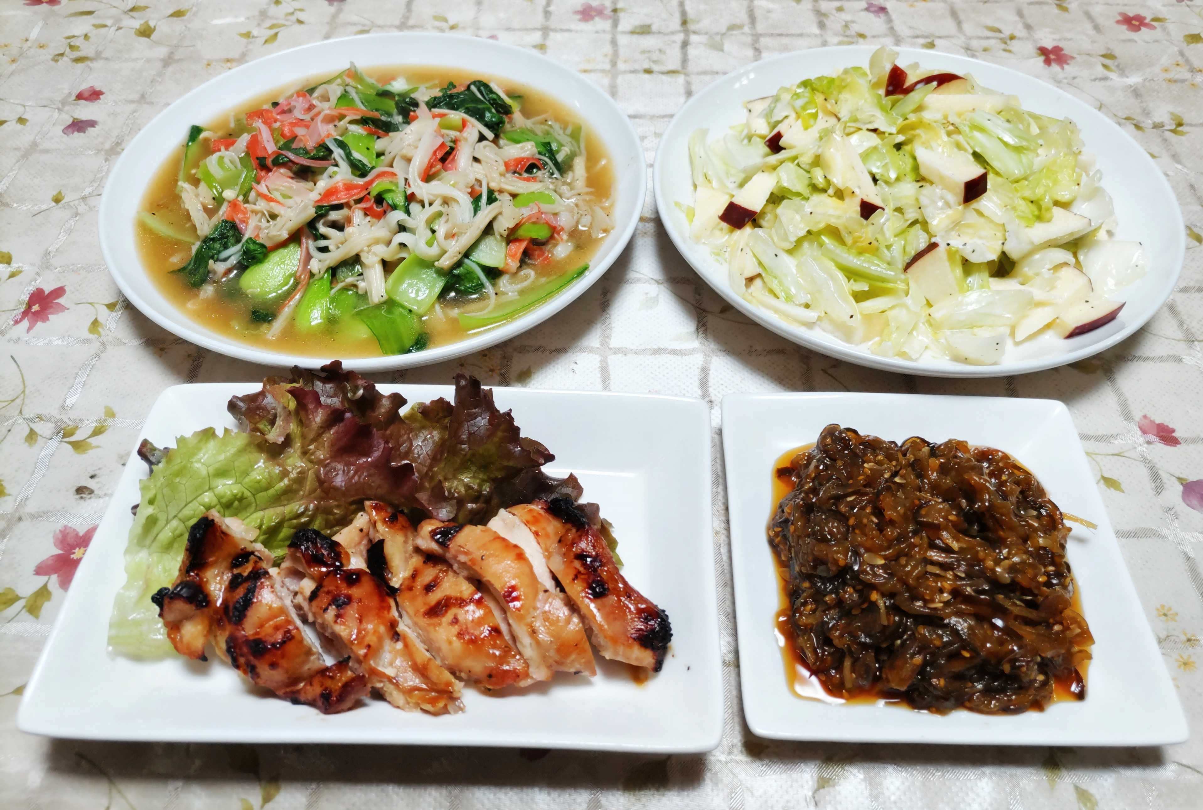 今日のごはん今日のごはんは鶏もも肉の照り焼き青梗菜のあんかけサラダキュウリの佃煮鶏もも肉の照り焼きは 鶏もも肉を醤油と味醂に浸けて置いてからグリルで焼きました。サニーレタスを添えて盛り付けました。青梗菜のあんかけは 青梗菜とほぐしたカニカマを炒め煮にしてあんかけにしました。サラダは 軽く塩もみしたキャベツとリンゴの甘酸っぱいサラダです。キュウリの佃煮は キュウリがたくさん収穫出来た時に佃煮にして冷凍保存しておいたものです。自然解凍して盛り付けました。友達と3人でランチに行きました。いつものお洒落なお蕎麦屋さん「たっさい」食べたのは「地野菜プレートセット デザート付き」最初に地野菜プレートから運ばれます。色々な野菜を使った料理が新鮮で美味しいです。スープはサツマイモのスープでした。次はメインのお蕎麦と天ぷらサクサクの天ぷらと茹でたての手打ち蕎麦が美味しいです。 デザートはわらび餅とゴマのアイスきな粉がまぶしであるわらび餅に餡こと黒蜜 コマのアイスと揚げたそば生地が添えられています。飲み物はホットの蕎麦茶おしゃべりしながら美味しくいただきました。気がついたら2時間経っていました。美味しいお蕎麦を食べた後は喜多院の境内で開催中の菊まつりを見に行きました。去年と同じように猛暑の影響で開花が遅れているようでまだ蕾のままの作品がほとんどでした。まだ開花途中です。こちらもちらほら咲き始めた所ハートの上部のピンク・黄色・白の花はよく見ると造花でした。この大きな菊の花も咲ききるともっと立派になるはずです。五重塔も花はチラホラ咲き始めたばかりでほとんどが葉っぱばかりでした。時間ができたらきれいに開花した作品をもう一度見に来たいと思いました。長かった楽天ブログの不具合がやっと直ったようで投稿できて良かったです。