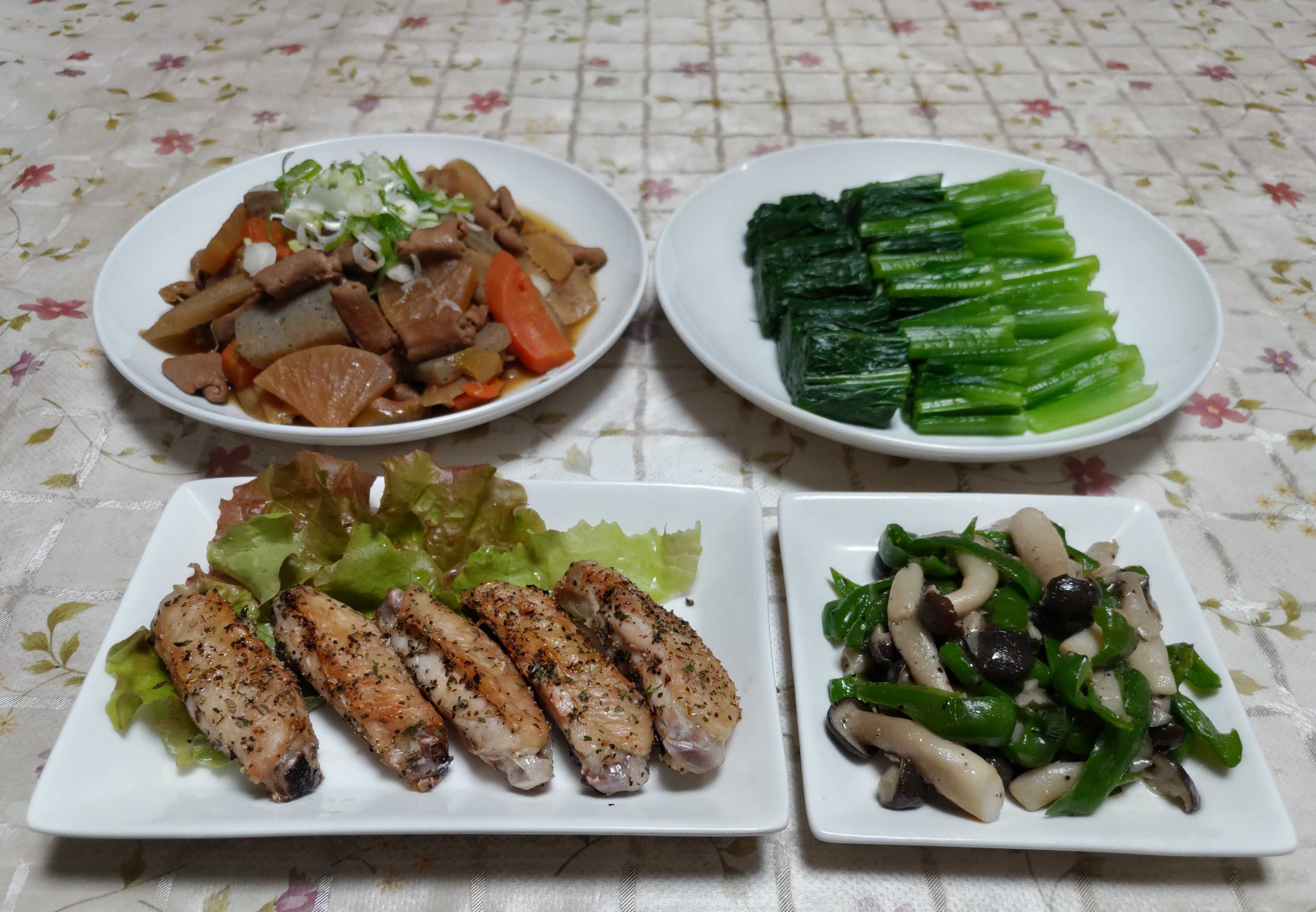 今日のごはん今日のごはんは鶏スペアリブのスパイス焼きシメジとピーマンの炒め物モツ煮小松菜のお浸し鶏スペアリブのスパイス焼きは 鶏スペアリブに塩コショウとミックスハーブをまぶしてグリルで香ばしくやきました。庭のサニーレタスを添えました。シメジとピーマンの炒め物は 細切りにしたピーマンとシメジをバターで炒めて塩コショウで味付けました。モツ煮は 下茹でした上モツと大根・人参・ゴボウ・コンニャク・長ネギ・生姜を入れて味噌・ミリン・醤油・酒・砂糖で味付けて圧力鍋で煮込みました。薬味ネギと七味唐辛子をたっぷりかけて食べました。小松菜のお浸しは 初収穫の小松菜を茹でてお浸しにしました。鰹節とお醤油をかけて食べました。先日ブロ友さんが「店でチャーハンを頼む人の気がしれない」と話されていました。冷蔵庫にある何を入れてもいいし残り物の片付けにもなると言われていて 私もですとコメントしました。冷蔵庫のある具材と残りご飯を使って作るチャーハンも美味しく食べられるからです。 それと家ではライスグラタンやマカロニグラタンも外ではほとんど注文しません。使いきれなくて賞味期限になってしまった牛乳で作ったホワイトソースと 残りご飯で作ったケチャップご飯でライスグラタンを作ります。今回も賞味期限になった使い残りの牛乳を使ってホワイトソースを作りマカロニがあったので冷蔵庫にあった椎茸・玉葱・鶏肉・茹でた間引き大根の葉を使ってマカロニグラタンを作りました。こうして残り物で作ったグラタンもチャーハンも残り物の片付けになり充分美味しいです。先週の事ですが 友人と北本市にある「アンジェラプレイスカフェ」へランチに行きました。車で1時間弱のドライブ中も楽しいおしゃべりの時間になりました。建物が南イタリアのアルベロベッロに似ていて可愛いお店です。久し振りの訪問で中に入るとリニューアルされてきれいになっていました。最初はサラダからたっぷりの生野菜の上に素揚げされた薄切りのサツマイモが乗っています。次はメイン料理でしたがパスタとピザを頼んで友人と二人でシェアして食べましたが写真がありません。料理が運ばれてきてすぐに取り分けて食べてしまって 家に帰って写真を見ていてメイン料理の写真を撮らなかった事に気が付きました。メイン料理の一つは「とり~りやわらか牛肉のクリームパスタ」二つ目は「生ハムとルッコラのピザとマルゲリータのハーフ&ハーフのピザ」柔らかく煮込まれた牛肉が乗せられたクリームパスタがとても美味しかったです。ピザ釜で香ばしく焼かれた生ハムとルッコラのピザとマルゲリータのハーフ&ハーフも普通に美味しかったです。写真を撮らなかったのが残念です。デザートは「おまかせケーキ」1つは 見た目がりんごそっくりのケーキお皿はジャムやフルーツソースでこんな風に絵が描かれて可愛いです。もう一つはチーズケーキこちらもきれいに絵が描かれています。ケーキも二人で半分ずつ両方食べました。こちらのチーズケーキの方が美味しかったです。飲み物はドリンクバーから好きな飲み物を選んで自分で淹れてきます。最初にカモミールティー 二杯目はコーヒーを頂きました。往復の車中とお店の中もずっと楽しくおしゃべりが続きました。やっぱり友人とのこう言う時間はとても大事です。去年の12月に頂いたハヤトウリを種用に残して置いて春に畑の隅に植えて置きました。零れ種で育った冬瓜に覆われてしまい枯れてしまうかと心配しましたが蔓延った冬瓜の葉の下で元気に育っていました。今では逆転してハヤトウリの方が元気に育って蔓延っています。小さな花が咲いてその下に可愛いハヤトウリの赤ちゃんが付いています。たくさんのハヤトウリが収穫できると楽しみにしています。たくさん採れたら軽く塩漬けをして水分を適度に出してから味噌漬けにする予定です。霜が降りると枯れてしまうのでなるべく霜の降りる日が遅いといいなと思っています。