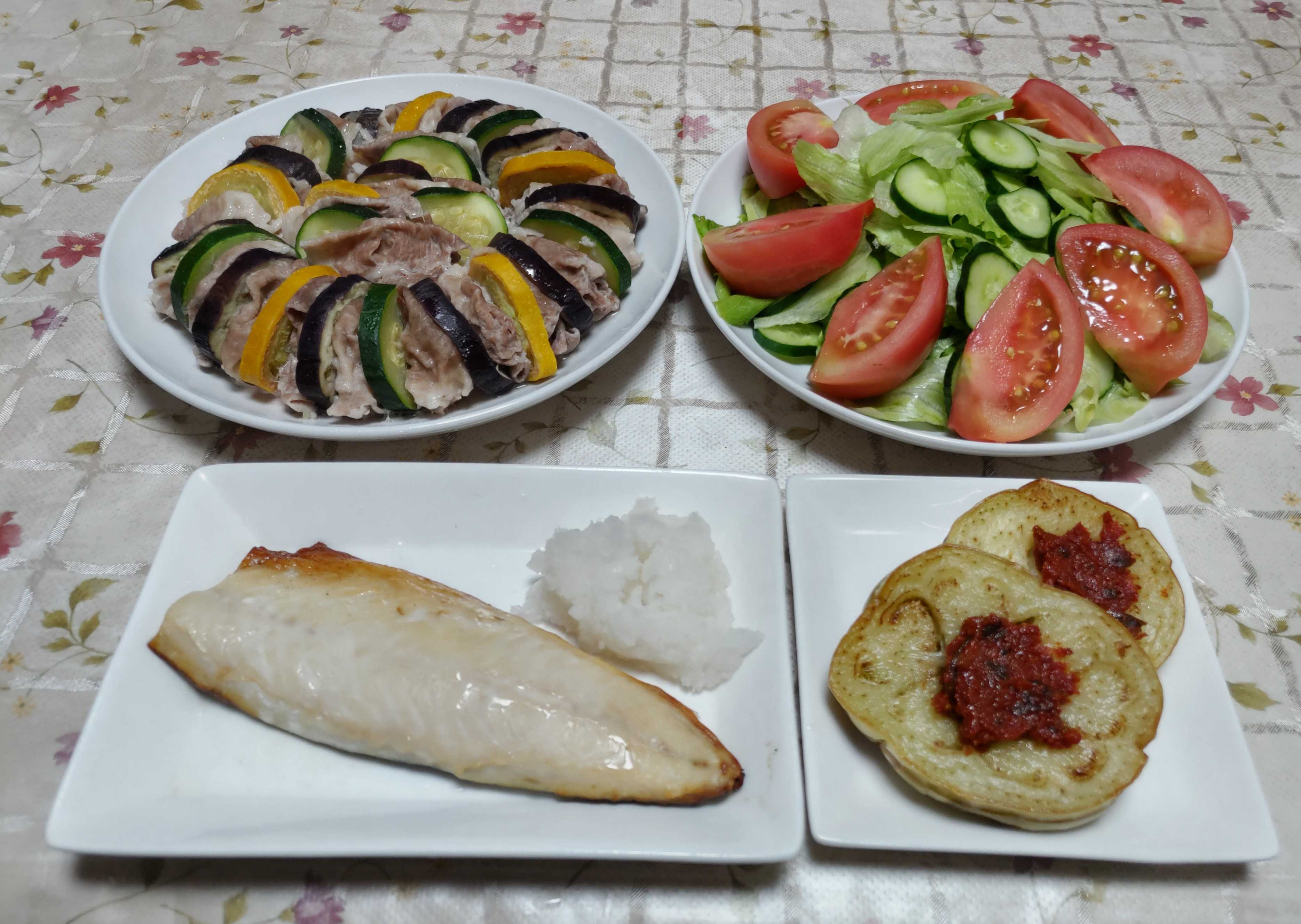 今日のごはん今日のごはんは塩サバ白ナスの蒸し焼きナスとズッキーニと豚肉のレンジ蒸しサラダ塩サバは 塩サバをグリルで焼いて大根おろしを添えました。白ナスの蒸し焼きは 輪切りにした白ナスをサラダ油を敷いたフライパンに入れて蓋をして蒸し焼きにしました。トロトロになりとても美味しかったです。先日旅先で買って来た辛みそを付けて食べました。ナスとズッキーニと豚肉のレンジ蒸しは ナスと緑色と黄色のズッキーニとシャブシャブ用の薄切り豚肉を順番に並べて電子レンジで蒸しました。これはブロ友さとママさんの真似をして作りました。私は手抜きしてポン酢しょうゆで食べました。サラダは レタス・キュウリ・トマトです。先日群馬県の伊香保温泉へ行った時に舞茸センターで買って来た「うまっ辛みそ」下仁田ネギ入りこれそんなに辛くなくて何に付けて食べても美味しいんです。でも野菜よりやっぱりお肉の方が合うかもです。毎日暑い日が続いています。畑の中は雑草が元気に育っているのでやらない訳には行かないです。里芋の畝の草取りをして追肥をして土寄せをしました。(土寄せは夫が)今年の夏は梅雨明け前から猛暑で雨が少なく里芋も苦しそうですがどうにか頑張って育っています。サツマイモの畝もサツマイモは元気に育っていますが雑草もたくさん育っています。サツマイモの畝も蔓を返しながら草取りをして追肥をしました。里芋やサツマイモを植えてある家から少し離れた畑の栗もたくさんの実を付けていて見に行くたびにイガが大きくなっています。今年もたくさん収穫できそうです。暑い中での作業にこんな熱中症対策をしています。これは私が使っているもので背中部分に保冷剤を入れて着るベストタイプのものです。夫はファンが付いている空調付きベストを使っています。こうして暑さに負けずに頑張っています。50年来の友人とのお話です。去年の秋にランチの約束をしていましたが友人が怪我をして延期になりました。年が明けて2月中旬に再び約束をしましたが今度は約束をした2日後に私が転んで手首の骨折をして再び延期になりました。私の骨折が良くなり再々約束をしたら今度は友人が風邪を引いて咳が酷いという事で再々延期しました。孫たちが夏休みに入るとまた出かけられなくなるので都合の合う日を調整して会う日を決めました。今回やっと友達と会う事ができてランチしてきました。「やっと会えたね」って。お店の目の前にあるハウスで収穫した新鮮な果物や野菜を活かしたカフェメニューやスイーツが食べられるお店「@FARM cafe」季節限定の「トマトハンバーグプレート」トマトを炊き込んだライスの上にハンバーグとデミグラスソースとチーズを乗せて焼いたトマトが乗せられていて 新鮮な野菜サラダがたっぷり添えられていて パンナコッタが付いています。優しい味付けでとても美味しかったです。サラダにかかっているドレッシングがまた美味しいです。食後のデザートは 季節限定の「河越抹茶パフェ」甘さ控えめの抹茶ムースの上にコーンフレークと抹茶寒天と抹茶アイスとクリームと白玉だんごと小豆 それに薄切りのサツマイモのカリントウ?ケンピ・が乗っています。友人は河越抹茶クレープでした。久し振りにやっと会えた友達とたくさんおしゃべりをしながら トマトハンバーグプレートを食べて それぞれデザートも食べて あっと言う間に3時間が過ぎていました。楽しい時間の後は 野菜の収穫をして薄暗くなるまで家の前の畑の草取りをしました。畑の草取りも全部終わる頃には最初きれいにした場所が元のように草ぼうぼうになっています。暑い夏は雑草との闘いが本当に大変です。特に今年は梅雨明け前から猛暑続きで雨が降らず野菜たちにとっても大変な夏です。そんな中で雑草は本当に元気に育っているんです。時々楽しい時間のご褒美をあげながら日々頑張っています。