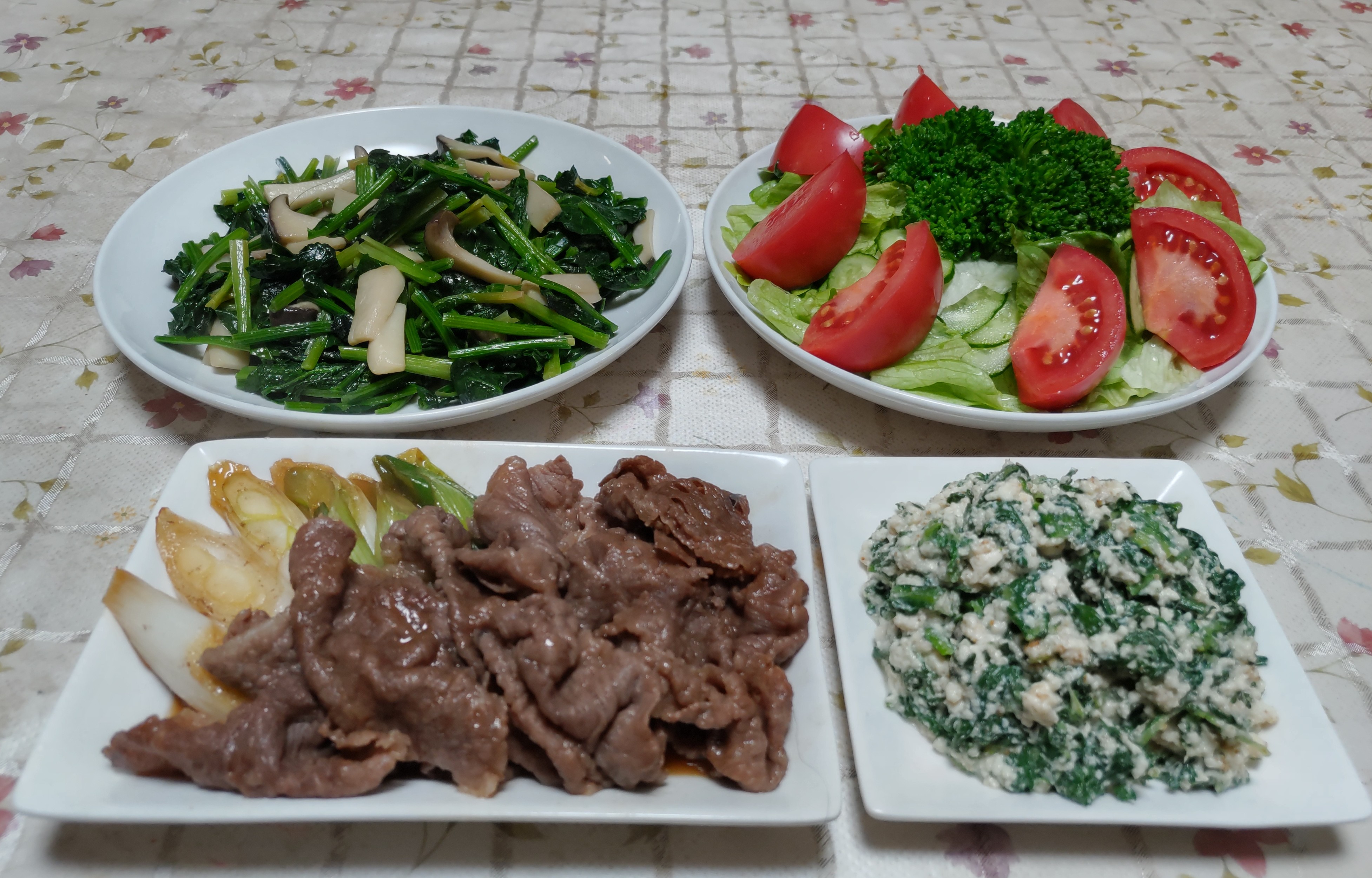 今日のごはん今日のごはんは長ネギと牛肉の甘辛煮春菊の白和えエリンギとホウレン草の炒め物サラダ長ネギと牛肉の甘辛煮は 長ネギと牛肉をすき焼き風に甘辛く煮ました。春菊の白和えは 春菊を茹でて白和えにしました。エリンギとホウレン草の炒め物は エリンギを炒めて醤油で軽く風味付けしてからホウレン草を入れて炒めて塩コショウで味を調えました。サラダは レタス・キュウリ・トマト・スティックブロッコリーです。去年の長引く猛暑の影響で遅くなって種蒔きしたスティックブロッコリーまだまだ小さくて収穫は春になってからと思っていました。久し振りにビニールトンネルの穴から覗いてみると頂花蕾が出来ていました。頂花蕾が500円玉位の大きさになっていたので側花蕾の成長の為に収穫しました。思いがけず収穫できたステックブロッコリーをサラダで美味しくいただきました。こちらも長引く猛暑の影響で種まきが遅れた上 発芽率が悪くて収穫を諦めて放っておいた春菊ダメもとでビニールトンネルの穴から覗いてみるとふさふさ元気に育っていました。少し収穫して白和えで食べました。風味が良くて美味しかったです。次は天ぷらにして食べたいです。